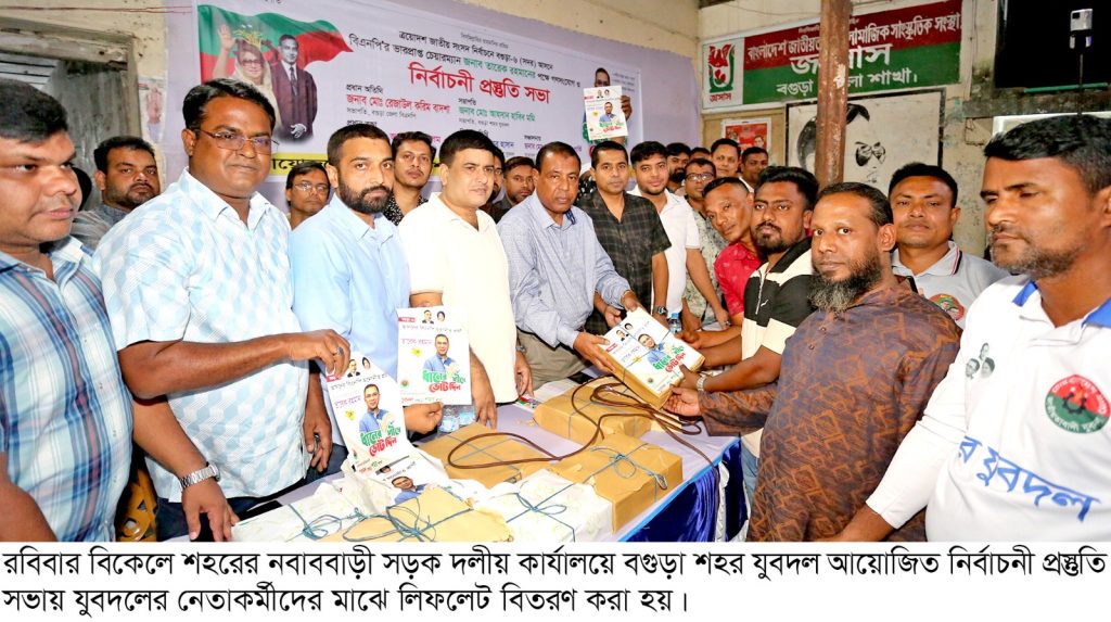 বগুড়া সংবাদ :ত্রয়োদশ জাতীয় সংসদ নির্বাচনকে সামনে রেখে বগুড়া-৬ (সদর) আসনে বিএনপি’র ভারপ্রাপ্ত চেয়ারম্যান তারেক রহমানের পক্ষে গণসংযোগ ও নির্বাচনী প্রস্তুতি সভা অনুষ্ঠিত হয়েছে। রবিবার (৯ নভেম্বর) সন্ধ্যায় শহরের নবাববাড়ী সড়ক দলীয় কার্যালয়ে শহর যুবদল এ সভার আয়োজন করে।