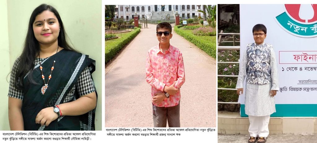 বগুড়া সংবাদ :বাংলাদেশ টেলিভিশন (বিটিভি) এর শিশু কিশোরদের প্রতিভা অন্বেষণ প্রতিযোগিতা নতুন কুঁড়িতে সাফল্য অর্জন করলো বগুড়ার তিন ক্ষুদে কণ্ঠশিল্পী। এই প্রতিযোগিতায় রবীন্দ্র সংঙ্গীতে ফাইনাল রাউন্ডে সেরাদশের, চতুর্থ স্থান অর্জন করে বগুড়া আর্মড পুলিশ ব্যাটালিয়ন পাবলিক স্কুল ও কলেজর চতুর্থ শ্রেণীর শিক্ষার্থী প্রজন্ম সান্যাল ঋক।