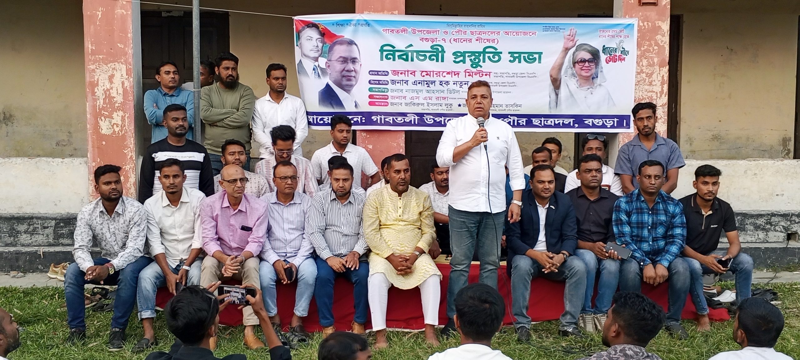 বগুড়া সংবাদ :(জাহাঙ্গীর আলম লাকি গাবতলী বগুড়) প্রতিনিধি : গতকাল সোমবার গাবতলী উপজেলা ও পৌর ছাত্রদলের উদ্যোগে ২০২৬ সালের নির্বাচনী প্রস্তুতিমূলক সভা স্থানীয় পাইলট মাঠে অনুষ্ঠিত হয়েছে। উপজেলা ছাত্রদলের সভাপতি নাজমুল হাসান ডিটলের সভাপতিত্বে অনুষ্ঠানে প্রধান অতিথির বক্তব্য রাখেন জেলা বিএনপির সহ-সভাপতি ও উপজেলা বিএনপির সভাপতি মোরশেদ মিল্টন। বিশেষ অতিথির বক্তব্যে রাখেন জেলা বিএনপির যুগ্ম সাধারণ সম্পাদক ও গাবতলী উপজেলা বিএনপির সাধারণ সম্পাদক এনামুল হক নতুন। উপজেলা ছাত্রদলের সাধারণ সম্পাদক এস এম রাঙ্গার সঞ্চালনায় আরোও বক্তব্য রাখেন উপজেলা বিএনপির সহ-সভাপতি ও নেপালতলী ইউনিয়ন বিএনপির সভাপতি জুলফিকার হায়দার গামা, সাংগঠনিক সম্পাদক মমিনুল হাসান মোমিন, শাহাদাত হোসেন খান সাগর, নাড়ুয়ামালা ইউনিয়ন বিএনপির সাধারন সম্পাদক ফিরোজ মন্ডল, জেলা ছাত্রদলের সাধারণ সম্পাদক এম আর হাসান পলাশ, পৌর বিএনপি’র যুগ্ম সাধারণ সম্পাদক হারুনুর রশিদ হারুন,