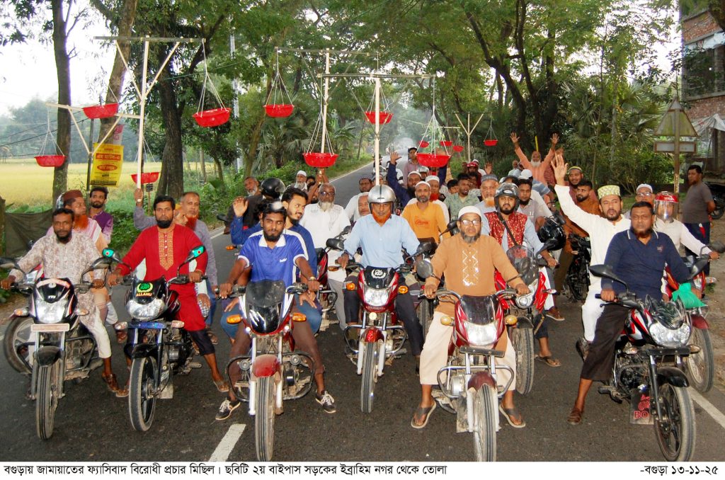 বগুড়া সংবাদ : বৃহস্পতিবার বগুড়ায় দিনভর ফ্যাসিবাদ বিরোধী মোটর সাইকেল মিছিল করেছে জামায়াতে ইসলামী। বগুড়া পৌর এলাকায় জামায়াতে ইসলামীর ১০টি পয়েন্টে জামায়াতে ইসলামীর মোটর সাইকেল মিছিল অনুষ্ঠিত হয়। বগুড়ার ২য় বাইপাস সড়কে অনুষ্ঠিত মিছিলে উপস্থিত ছিলেন মাওলানা আব্দুল জলিল, অধ্যাপক হারুনার রশিদ, ২১নং ওয়ার্ড আমীর আব্দুস সালাম, সেক্রেটারী মাহবুবুর রহমান, মাস্টার আনছার আলী, মাওলানা মিনহাজুল ইসলাম প্রমুখ। মিছিল শেষে বিকেলে ইব্রাহিম নগর এক প্রতিবাদ সভা অনুষ্ঠিত হয়। সমাবেশে বক্তরা বলেন, গণহত্যাকারী কার্যক্রম নিষিদ্ধ পলাতক আওয়ামী লীগ পুরনো কায়দায় দেশে আগুন সন্ত্রাস ও নাশকতার ষড়যন্ত্র করছে। তারা পালিয়ে থেকে দেশে লকডাউনের ডাক দিয়ে নাশকতা উস্কে দিচ্ছে। এর পরিনতি ভালো হবেনা। আগুন সন্ত্রাসী ও নাশকতাকারীদের রাজপথে কোন ছাড় দেয়া হবেনা। ২ হাজার ছাত্র-জনতার শাহাদাত ও ৩০ হাজারের বেশী আহতের রক্তের বিনিময়ে দেশ ফ্যাসিবাদ মুক্ত হয়েছে। এদেশের রাজনীতিতে ফ্যাসিস্ট আওয়ামী লীগ ও তার দোসরদের কোন স্থান নেই। বগুড়া শহর জামায়াতের প্রচার সেক্রেটারী অধ্যক্ষ ইকবাল হোসেন জানান, বগুড়ার ১০টি পয়েন্টে দিনভর আমরা অবস্থান করেছি ও ফ্যাসিবাদ বিরোধী মোটর সাইকেল শোভাযাত্রা করেছি।