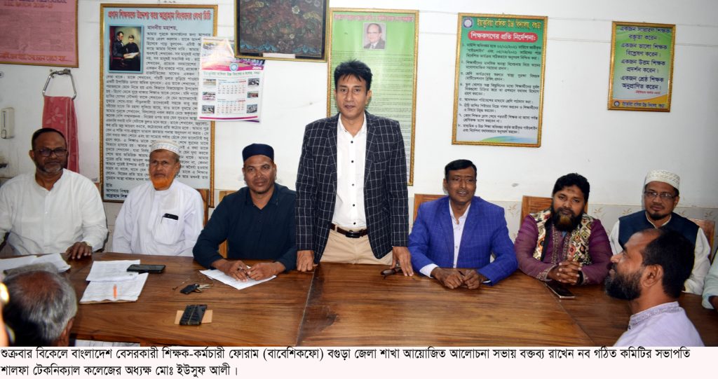 বগুড়া সংবাদ : বাংলাদেশ বেসরকারী শিক্ষক-কর্মচারী ফোরাম (বাবেশিকফো) বগুড়া জেলা কমিটি গঠন উপলক্ষে আলোচনা সভা অনুষ্ঠিত হয়েছে। শুক্রবার বিকেলে শহরের ইয়াকুবিয়া উচ্চ বালিকা উচ্চ বিদ্যালয়ের হল রুমে এ সভা অনুষ্ঠিত হয়। শিক্ষক জিল্লুর রহমান বাদলের সভাপতিত্বে বিভিন্ন শিক্ষা প্রতিষ্ঠানের সচেতন শিক্ষক সমাজের উপস্থিতিতে ৭১ সদস্য বিশিষ্ট কমিটি ঘোষনা করা হয়। সভায় সর্ব সম্মতিক্রমে শালফা টেকনিক্যাল কলেজের অধ্যক্ষ মোঃ ইউসুফ আলীকে সভাপতি এবং ইয়াকুবিয়া বালিকা উচ্চ বিদ্যালয়ের ভারপ্রাপ্ত প্রধান শিক্ষক ফেরদৌস আলম ফারুক কে সাধারণ সম্পাদক হিসেবে ঘোষনা করা হয়। এফ এম সহিদুল ইসলাম জয় এর সঞ্চালনায় এতে উপস্থিত ছিলেন জেলার বিভিন্ন শিক্ষা প্রতিষ্ঠানের প্রধান শিক্ষক গন। সভায় বিভিন্ন আলোচনা ও পরামর্শের মাধ্যমে শিক্ষকদের সম্যসা তুলে ধরা হয়। বিশেষ করে সরকারী নিয়মে বাড়ি ভাড়া, ১০০ ভাগ উৎসব ভাতা শ্রান্তিকারীন ভাতা, পূর্ণ চিকিৎসা ভাতা সহ বিএড বৈষম্য ছাড়াও শিক্ষক পদায়ন এবং শিক্ষার সার্বিক উন্নয়নের কথা উঠে আসে।