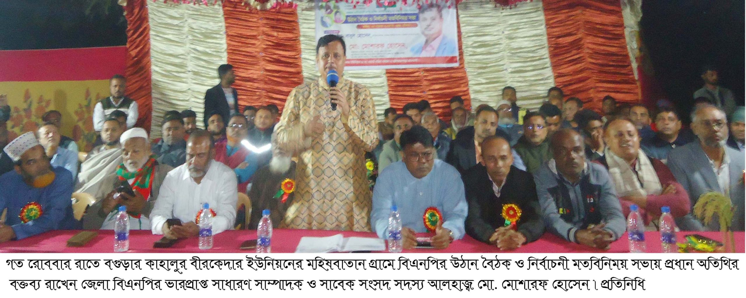 গত রোববার রাতে বগুড়ার কাহালুর মহিষবাতান গ্রামে বীরকেদার ইউনিয়নের ৯ নম্বর ওয়ার্ড বিএনপির আয়োজনে উঠান বৈঠক ও নির্বাচনী মতবিনিময় সভায় প্রধান অতিথির বক্তব্যে উপরোক্ত কথাগুলো বলেন তিনি।