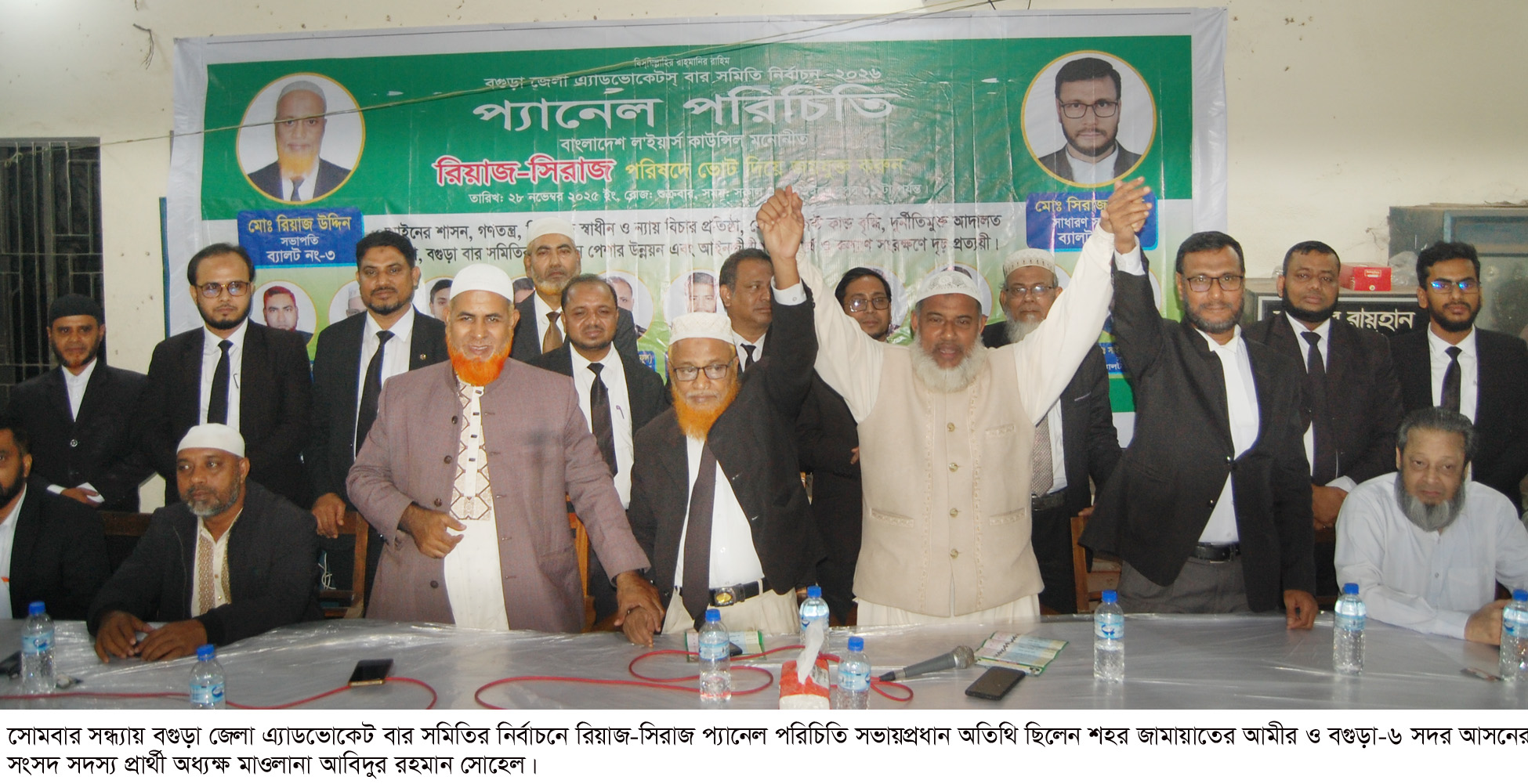 বগুড়া সংবাদ : বগুড়া জেলা এ্যাডভোকেট বার সমিতির নির্বাচন উপলক্ষে সোমবার সন্ধ্যায় বাংলাদেশ ল’ইয়ার্স কাউন্সিলর মনোনীত রিয়াজ-সিরাজ প্যানেলের পরিচিতি সভা এ্যাডভোকেট রিয়াজ উদ্দিনের সভাপতিত্বে অনুষ্ঠিত হয়। অনুষ্ঠানে প্রধান অতিথি ছিলেনসংগঠনের প্রধান উপদেস্টা, শহর জামায়াতের আমীর ও বগুড়া-৬ সদর আসনের সংসদ সদস্য প্রার্থী অধ্যক্ষ মাওলানা আবিদুর রহমান সোহেল। কাউন্সিলের সেক্রেটারী নুরুল ইসলাম আকন্দের পরিচালনায় অনুষ্ঠানে বিশেষ অতিথি ছিলেন শহর জামায়াতের সেক্রেটারি আ স ম আব্দুল মালেক, সহ সেক্রেটারী অধ্যাপক রফিকুল আলম,অ্যাডভোকেট মোখলেসুর রহমান। আরো উপস্থিত ছিলেন শহর জামায়াতের যুব ও ক্রীড়া সম্পাদক অধ্যাপক আব্দুস সালাম তুহিন, দাওয়াহ ও প্রশিক্ষণ সম্পাদক ড. মাওলানা হেদায়েতুল ইসলাম, অ্যাডভোকেট আল আমিন, অ্যাডভোকেট শাহীন মিয়া, অ্যাডভোকেট সিরাজুল হক, অ্যাডভোকেট সাইফুদ্দিন সাইফুল, অ্যাডভোকেট আব্দুস সালাম, অ্যাডভোকেট আবু বক্কর সিদ্দিক, অ্যাডভোকেট নজরুল ইসলাম, অ্যাডভোকেট বাবুল রহমান, এডভোকেট জান্নাতুল রহমান প্রমুখ। প্রধান অতিথি বলেন, ফ্যাসিস্ট সরকার ক্ষমতা দীর্ঘস্থায়ী করতে জামায়াতে ইসলামীর উপর জুলুম নির্যাতনের স্ট্রীম রোলার চালিয়েছে। আপনারা পাশে ছিলেন বলেই আমরা জামিন পেয়েছি। আমিও অনেকবার জেল খেটেছি। বগুড়া বারে সৎ যোগ্য নেতৃত্ব প্রতিষ্টা করতে হলে আপনাপরা সবাই রিয়াজ সিরাজ প্যানেল কে বিজয়ী করুণ। আগামী ২৮ নভেম্বর ভোট গ্রহণ অনুষ্ঠিত হবে।
