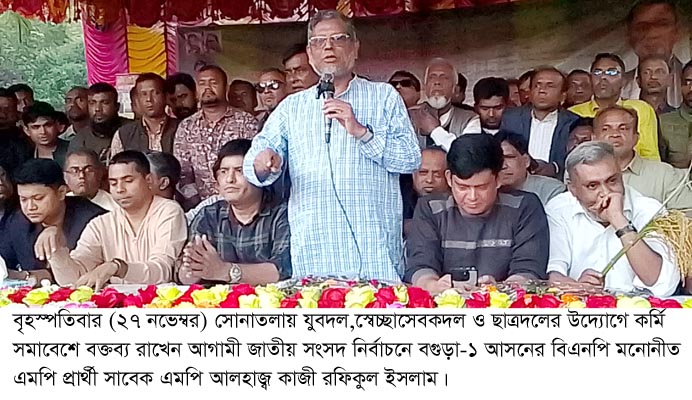 বগুড়া সংবাদ : সোনাতলায় শহীদ সৈকত চত্বরে বিএনপির অঙ্গদল যুবদল,স্বেচ্ছাসেবক দল ও ছাত্রদলের যৌথ উদ্যোগে বৃহস্পতিবার (২৭ নভেম্বর) বিকেলে কর্মি সমাবেশ অনুষ্ঠিত হয়েছে। উপজেলা যুবদলের সভাপতি রাশেদুর রহমান হান্নানের সভাপতিত্বে সমাবেশে প্রধান অতিথির বক্তব্য রাখেন আগামী জাতীয় সংসদ নির্বাচনে বগুড়া-১ আসনের বিএনপি মনোনীত এমপি প্রার্থী সাবেক এমপি আলহাজ্ব কাজী রফিকুল ইসলাম। তিনি বক্তব্যে বলেছেন যুবদল,সেচ্ছাসেবক দল ও ছাত্রদল আমাদের প্রধান শক্তি। এই শক্তিকে আমাদের নেতা তারেক রহমান ধরে রেখেছেন। এরাই আমাদের এদেশের ভবিষ্যত। তিনি আরো বলেন তারেক রহমান দেশ ও দেশের মানুষের উন্নয়নের জন্য রাষ্ট্রকাঠামো মেরামতের ৩১ দফা দাবী জাতির কাছে তুলে ধরেছেন। এটি বাস্তবায়ন হলে এদেশ হবে উন্নয়নশীল দেশ। অন্যদের মধ্যে বক্তব্য রাখেন বগুড়া জেলা যুবদলের সভাপতি জাহাঙ্গীর আলম,সাধারণ সম্পাদক আবু হাসান,জেলা স্বেচ্ছাসেবক দলের সভাপতি সরকার মুকুল, সাধারণ সম্পাদক রাকিবুল ইসলাম শুভ,জেলা ছাত্রদলের সভাপতি হাবিবুর রহমান সন্ধান,জেলা মহিলাদলের যুগ্ম সাধারণ সম্পাদক গাজী সায়লা ইসলাম মুক্তা প্রমুখ। উপস্থিত ছিলেন দিগদাইড় ইউপি চেয়ারম্যান শহিদুল হক টুল্লু,পাকুল্লা ইউপি চেয়ারম্যান লতিফুল বারী টিম, জোড়গাছা ইউপি চেয়ারম্যান গোলাম রব্বানী,বালুয়া ইউপির সাবেক চেয়ারম্যান শফিকুল ইসলাম শাফি,নাছির উদ্দিন আঞ্জু,উপজেলা বিএনপির সাধারণ সম্পাদক জিয়াউল হক লিপন,বিএনপি নেতা আলী হাসান নারুন,পৌর বিএনপির সাধারণ সম্পাদক শরিফুল ইসলাম খান নিপু,সাংগঠনিক সম্পাদক রাজ্জাকুল ইসলাম,সাবেক ছাত্রদল নেতা কামরুল হাসান বাবু,উপজেলা সমবায় দলের সভাপতি মাসুদুর রহমান,উপজেলা ছাত্রদলের সভাপতি সাজ্জাদুর রহমান চাঁনসহ বিএনপি ও অঙ্গদলের নেতৃবৃন্দ।