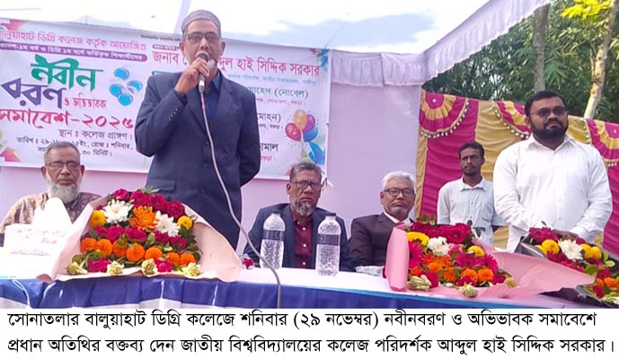 বগুড়া সংবাদ : সোনাতলার বালুয়াহাট ডিগ্রি কলেজ প্রশাসনের আয়োজনে শনিবার (২৯ নভেম্বর) দুপুরে একাদশ ও ¯œাতক প্রথম বর্ষের শিক্ষার্থীদের নবীনবরণ ও অভিভাবক সমাবেশ অনুষ্ঠিত হয়েছে। কলেজের গভর্নিং বডির সভাপতি আহসান হাবিব মোহনের সভাপতিত্বে অনুষ্ঠানে প্রধান অতিথির বক্তব্য দেন জাতীয় বিশ্ববিদ্যালয়ের কলেজ পরিদর্শক আব্দুল হাই সিদ্দিক সরকার। তিনি বক্তব্যে বলেছেন,আমরা লেখপড়া করি নিজের ভবিষ্যতের জন্য। পুঁথিগত বিদ্যার পাশাপাশি আমাদেরকে নীতি-নৈতিকতা,আদর্শবোধ,সততা ও দেশপ্রেম এসব শিক্ষা নিতে হবে। তবেই উচ্চ শিখড়ে ওঠা সম্ভব হবে। তিনি আরো বলেছেন,আজকে যদি এদেশে তৈরি পোশাক শিল্প না থাকতো তাহলে এদেশের অর্থনৈতিক অবস্থা ভালো থাকতো না। লক্ষ লক্ষ মা,ভাই-বোনেরা আজকে এই সেক্টরে কাজ করে জীবিকা নির্বাহ করছে। অন্যদের মধ্যে বক্তব্য দেন কলেজের অধ্যক্ষ এটিএম মোস্তফা কামাল,হিতৈষী সদস্য আবু নাছের ওয়াহেদ নবেল,সহকারী অধ্যাপক জিয়াউল ইসলাম শান্তু,ইসরাত জাহান,বালুয়া ইউনিয়ন কৃষকদলের সভাপতি আনিছুর রহমান, শিক্ষার্থী এমআর হাসান রিয়াদ, লেলিন আকতার মিতু,রাব্বি হাসান,রাফিন জাহান প্রমুখ। উপস্থিত ছিলেন কলেজের সাবেক সহকারী অধ্যাপক এটিএম গোলাম রকিব ও বালুয়া ইউনিয়ন পরিষদের ভারপ্রাপ্ত চেয়ারম্যান আব্দুর রাজ্জাক-সহ কলেজের সকল শিক্ষক, শিক্ষার্থী ও অভিভাবকরা। অনুষ্ঠানের প্রথমে জাতীয় পতাকা উত্তোলন করা হয় এবং অতিথিদের ফুল ও ক্রেস্ট দিয়ে বরণ করা হয়। আর নবীন শিক্ষার্থদের বরণ করে নেয়া হয় ফুল দিয়ে। অনুষ্ঠানের দ্বিতীয় পর্বে সাংস্কৃতিক ও নৃত্যানৃষ্ঠান অনুষ্ঠিত হয়।