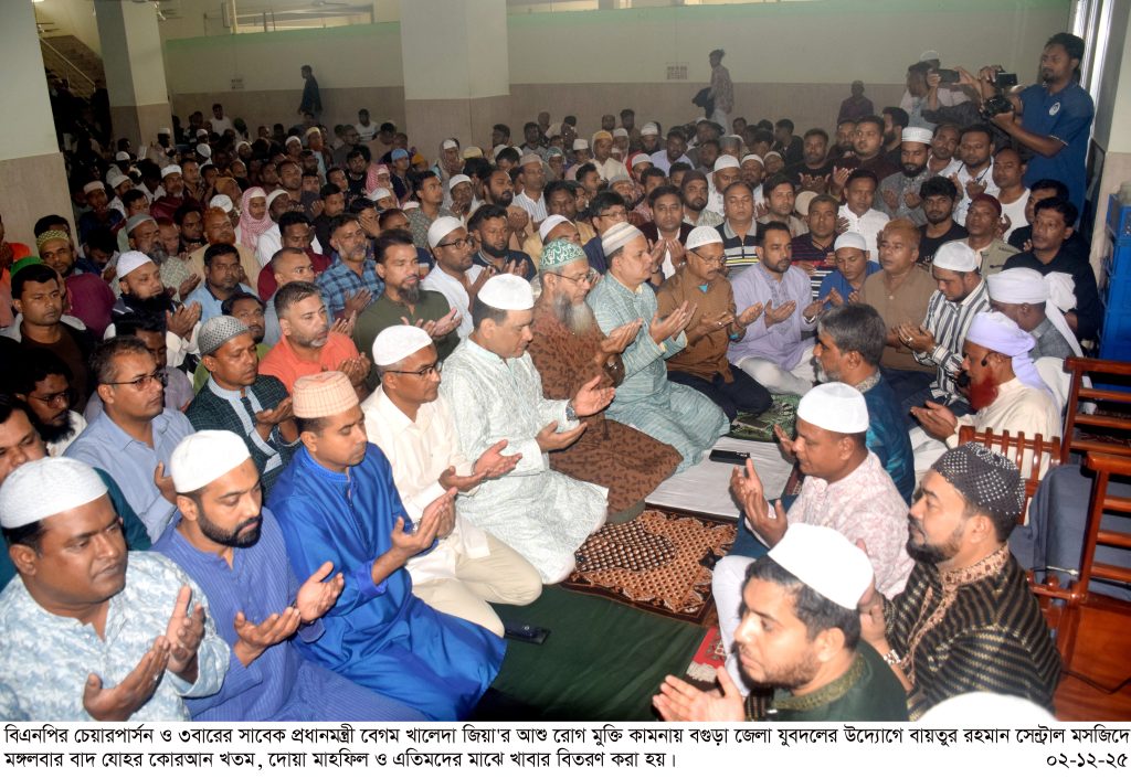 জেলা যুবদলের সভাপতি জাহাঙ্গীর আলম ও সাধারন সম্পাদক আবু হাসানের সার্বিক ব্যবস্থাপনায় দোয়া মাহফিলে উপস্থিত ছিলেন জেলা বিএনপি’র ভারপ্রাপ্ত সাধারন সম্পাদক মোশারফ হোসেন, কেন্দ্রীয় নির্বাহী কমিটির সদস্য আলী আজগর তালুকদার হেনা ও জয়নুল আবেদীন চান, জেলা বিএনপি’র সাংগঠনিক সম্পাদক শহিদ উন নবি সালামসহ বিভিন্ন পর্যায়ের নেতৃবৃন্দ উপস্থিত ছিলেন। নেতৃবৃন্দরা বলেন, বগুড়ার পুত্রবধূ বেগম খালেদা জিয়া শুধু সাবেক তিনবারের সফল প্রধানমন্ত্রী নয় তিনি জনগণের নেত্রী। জেল, জুলুম, অন্যায়, অবিচার সবকিছু মাথা পেতে নিলেও কখনো অন্যায়ের কাছে আপোষ করেননি। এজন্য তিনি সারাদেশে একমাত্র আপোষহীন নেত্রী হিসেবে সকলের কাছে স্বীকৃত। তার গুরুতর অসুস্থতায় সারাদেশের কোটি জনতা আজ তার জন্য আল্লাহর দরবারে হাত তুলে দোয়া করছেন। বগুড়াতে বিএনপি ও এর অঙ্গ সংগঠনগুলোর পাশাপাশি দল-মত নির্বিশেষে সাধারণ জনগণ তার সুস্থতার জন্য ফরিয়াদ করে যাচ্ছেন।