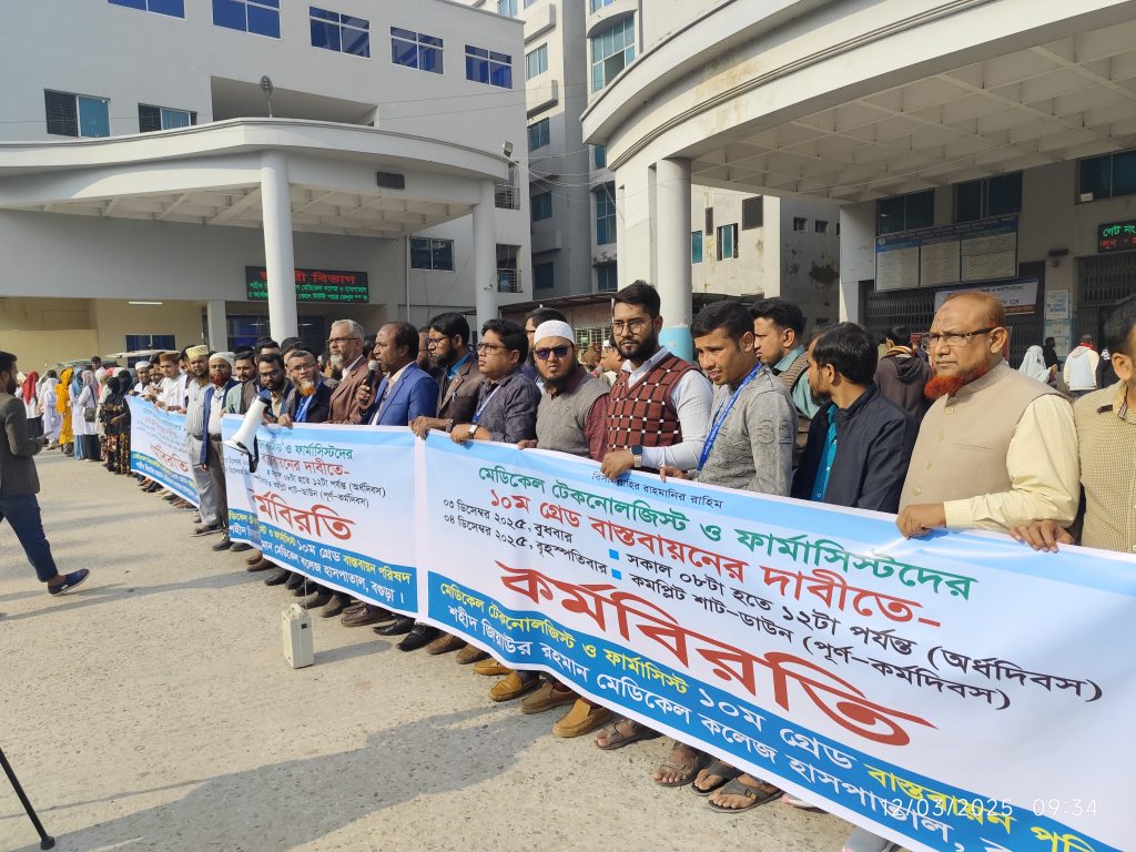 বগুড়া সংবাদ : মেডিকেল টেকনোলজিস্ট ও ফার্মাসিস্ট ১০ম গ্রেড বাস্তবায়ন পরিষদ এর উদ্যোগে কেন্দ্রীয় ১দফা কর্মসূচির অংশ হিসাবে বগুড়া শহীদ জিয়াউর রহমান মেডিকেল কলেজ ও হাসপাতাল, ২৫০ শয্যা বিশিষ্ট বগুড়া মোহাম্মদ আলী হাসপাতাল, টিবি ক্লিনিক, জেলার সকল উপজেলা স্বাস্থ্য কমপ্লেক্স, উপ স্বাস্থ্য কেন্দ্র, পরিবার কল্যান কেন্দ্র সহ সকল সরকারি-বেসরকারি হাসপাতাল, ক্লিনিক, ডায়াগনস্টিক সেন্টারে একযোগে ৩রা ডিসেম্বর’২০২৫ সকাল ৮টা হতে দুপুর ১২টা পর্যন্ত টানা ৪ঘন্টা কর্মবিরতি পালিত হয়। কর্মবিরতি চলাকালিন সময়ে বগুড়া শহীদ জিয়াউর রহমান মেডিকেল কলেজ ও হাসপাতাল এর সম্মুখে সকল মেডিকেল টেকনোলজিস্ট ও ফার্মাসিস্ট একত্রিত হয়ে ১০ম গ্রেড বাস্তবায়নের জন্য সরকারের নিকট দাবী জানান। উক্ত মানববন্ধনে বক্তব্য রাখেন এরশাদ হোসেন, শরিফুল ইসলাম, বদিউজ্জামান, আবুল কালাম আজাদ, ফিরোজ, রউফ, ইয়াকুব, আহমেদ , আব্দুস সাত্তার, হুমায়ুন কবির, মাহবুব রহমান ,মানুবার রহমান, প্রমুখ।
