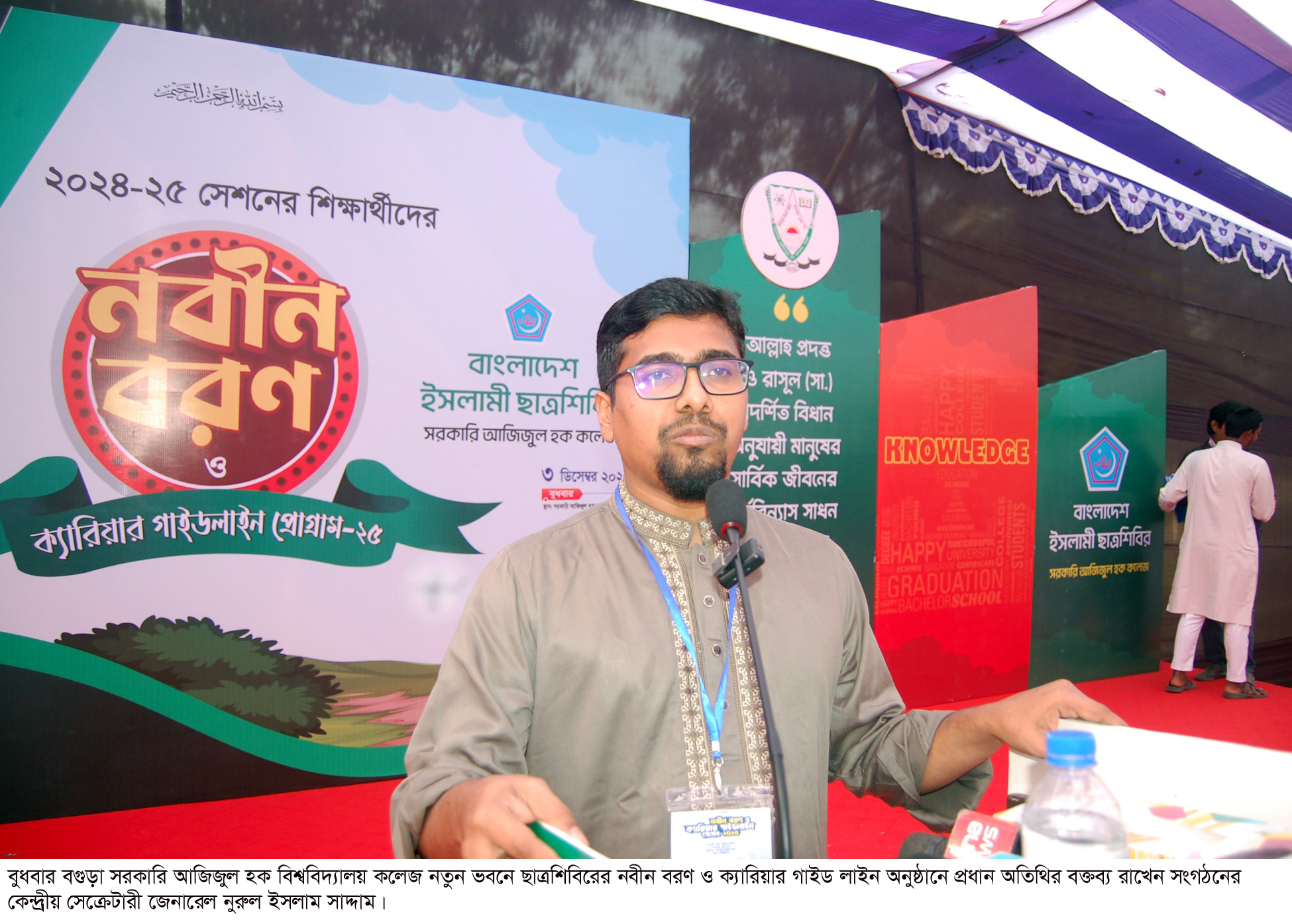 বগুড়া সংবাদ : ইসলামি ছাত্রশিবিরের কেন্দ্রীয় সেক্রেটারি জেনারেল নুরুল ইসলাম সাদ্দাম বলেছেন, স্মার্ট বাংলাদেশ গড়তে ছাত্র সমাজকে স্মার্ট নাগরিক হয়ে গড়ে উঠতে হবে। দেশের ছাত্র জনতা সন্ত্রাস দুর্নীতিমুক্ত ক্যাম্পাস দেখতে চায়। এজন্য ছাত্ররা ঢাকা বিশ্ববিদ্যায়ল সহ সকল ছাত্র সংসদ নির্বাচনে ছাত্রশিবির কে বেছে নিয়েছে। নবীণদের তিনি বলেন আপনারা জীবনের গাইডলাইন ঠিক রেখে এগিয়ে যান জীবনে অবশ্যই সফলতা আসবে। তিনি বুধবার সকালে বগুড়া সরকারি আজিজুল হক কলেজ ছাত্রশিবিরের সভাপতি আব্দুল্লাহ আল মামুনের সভাপতিত্বে নবীন বরণ’ ২৫ ও ক্যারিয়ার গাইড লাইন অনুষ্ঠানে প্রধান অতিথির বক্তব্য রাখছিলেন। সেক্রেটারি সাকিব হাসান তামিমের পরিচালনায় অনুষ্ঠানে আরো বক্তব্য রাখেন ইফসুর সেক্রেটারি জেনারেল ও বগুড়া-৪ আসনের সংসদ সদস্য প্রার্থী ড. মোস্তফা ফয়সাল পারভেজ, কেন্দ্রীয় প্ল্যানিং অ্যান্ড ডেভেলপমেন্ট সম্পাদক রিয়াজুল ইসলাম, কেন্দ্রীয় কাপ সদস্য ও বগুড়া শহর শাখার সভাপতি হাবিবুল্লাহ খন্দকার, শহর সেক্রেটারি শফিকুল ইসলাম। উপস্থিত ছিলেন আকসুর সাবেক ধর্মীয় সম্পাদক ও বগুড়া সদর -৬ আসনের সংসদ সদস্য প্রার্থী অধ্যক্ষ মাওলানা আবিদুর রহমান সোহেল, আকসুর সাবেক জিএস অধ্যাপক আ স ম আব্দুল মালেক, সাবেক জিএস ইউসুফ আলী, সাবেক নাট্য সম্পাদক ও ৮ নং ওয়ার্ডের সাবেক কাউন্সিলর এরশাদুল বারী এরশাদ, সাবেক ছাত্রনেতা সেলিম রেজা, আব্দুস সালাম তুহিন।