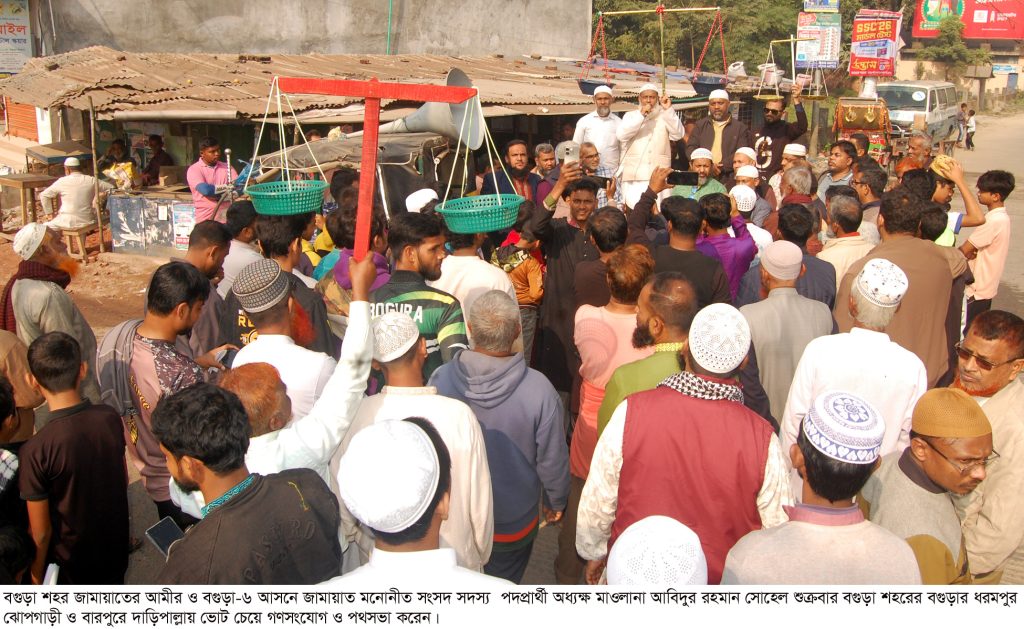 বগুড়া সংবাদ : বগুড়া শহর জামায়াতের আমীর ও বগুড়া-৬ আসনের সংসদ সদস্য অধ্যক্ষ মাওলানা আবিদুর রহমান সোহেল বলেছেন, সমাজে কুরআন প্রতিষ্ঠার জন্য জামায়াতে ইসলামীর প্রধান কাজ। আমরা দেশকে এক বৈষম্যহীন, দুর্নীতি, দুঃশাসন, মাদক ও অপরাধমুক্ত এক নতুন বাংলাদেশে পরিণত করার জন্য দীর্ঘদিন ধরে সমাজে কাজ করে যাচ্ছি। সমাজে শান্তি ও ন্যায়বিচার প্রতিষ্ঠা হলে কেউ মাদকের আশেপাশে যাবেনা। আমরা এমন এক সমাজ কায়েম করতে চাই যে সমাজের মানুষের সকল ধরনের মৌলিক অধিকারের নিশ্চিয়তা থাকবে। তিনি শুক্রবার সকালে বগুড়া শহরের বগুড়ার ধরমপুর ,ঝোপগাড়ী ও বারপুরে দাড়িপাল্লায় ভোট চেয়ে গণসংযোগ ও পথসভায় এ কথা বলেন।