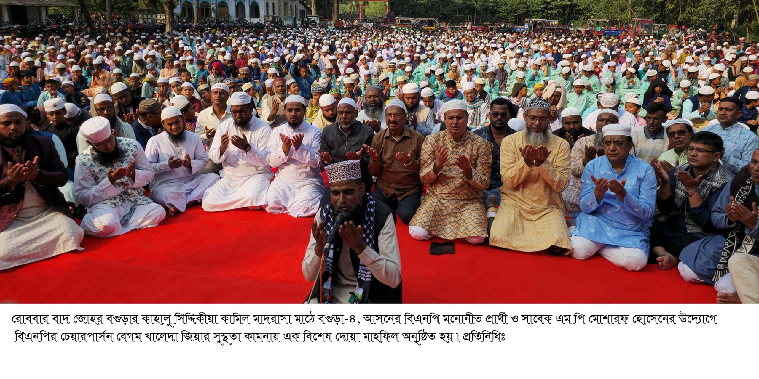 বগুড়া সংবাদ : সাবেক প্রধানমন্ত্রী ও বিএনপির চেয়ারপারসন বেগম খালেদা জিয়ার আশু রোগমুক্তি ও সুস্থতা কামনায় কাহালুতে বিশেষ দোয়া মাহফিল অনুষ্ঠিত হয়েছে। রোববার দুপুরে বগুড়ার কাহালু সিদ্দিকীয়া কামিল (মাস্টার্স) মাদরাসা মাঠে বগুড়া-৪ (কাহালু–নন্দীগ্রাম) আসনের বিএনপি মনোনীত প্রার্থী ও সাবেক এমপি আলহাজ্ব মা. মাশারফ হাসানের উদ্যোগে এবং উপজেলা ও পৌর বিএনপি ও অঙ্গসহযোগী সংগঠনের তত্ত্বাবধানে এ দোয়া ও মোনাজাত অনুষ্ঠিত হয়।
