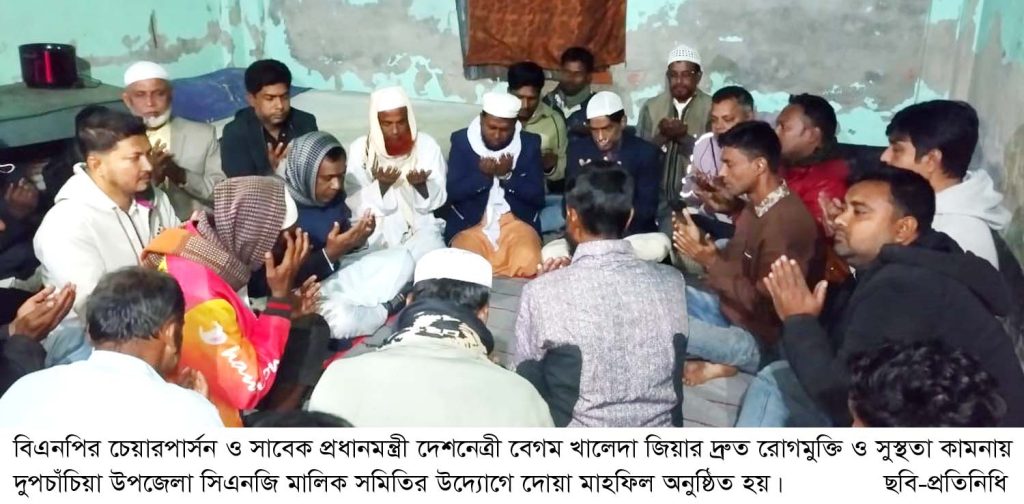 বগুড়া সংবাদ : বিএনপির চয়ারপার্সন ও সাবক প্রধানম¿ী দশনত্রী বগম খালদা জিয়ার দ্রæত রাগমুক্তি ও সু¯তা কামনায় দুপচাঁচিয়া উপজলা সিএনজি মালিক সমিতির উদ্যাগ দায়া মাহফিল অনুষ্ঠিত হয়ছ। ৬ ডিসম্বর শনিবার রাত উপজলার একটি ¯ানীয় এতিমখানায় এ দায়া মাহফিলর আয়াজন করা হয়। উপজলা সিএনজি মালিক সমিতির সভাপতি হুমায়ুন কবির ও সাধারণ সম্পাদক জাহিদুর ইসলাম সুজনর সার্বিক সহযাগিতায় অনুষ্ঠান দলীয় নতাকর্মী ও সমিতির সদস্যরা অংশ নন।দায়া মাহফিল উপ¯িত ছিলন উপজলা বিএনপির সাবক সভাপতি আব্দুল হামিদ, সাবক সাধারণ সম্পাদক ও সাবক পর ময়র জাহাঙ্গীর আলম, পশ্চিম বগুড়া সিএনজি মালিক সমিতির উপদষ্টা হারুনুর রশিদ সাজু, পর বিএনপির ভারপ্রাপ্ত সভাপতি ও উপদষ্টা অ্যাডভাকট সাইফুর রহমান, সাধারণ সম্পাদক আখতারুজ্জামান তুহিন, উপজলা যুবদলর আহায়ক ও উপদষ্টা আফছার আলী, যুবদল নতা ও উপদষ্টা আশরাফুল আলম, সদর ইউনিয়ন বিএনপির সাধারণ সম্পাদক ইউপি চয়ারম্যান মায়াজ্জম হাসন, উপজলা যুবদলর যুগ্ম আহায়ক আব্দুস সবুর খদকার রাকিব, পর যুবদলর সিনিয়র যুগ্ম আহায়ক নাঈম কবিরাজ, সমিতির সহ-সভাপতি আনায়ার হাসন, সাংগঠনিক সম্পাদক রাশদুজ্জামান রাকিব, রাড সম্পাদক আব্দুল কাদর সবুজসহ সমিতির সকল সদস্যবদ। দশনত্রীর আশু রাগমুক্তি, দশর শাÍি ও সমদ্ধি কামনা কর বিশষ মানাজাত করন হাফজ মাওলানা মহদুল ইসলাম।