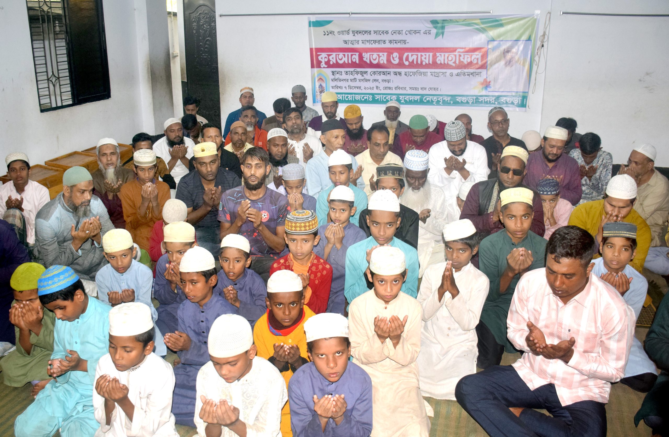 বগুড়া সংবাদ : বগুড়া শহরের ১১নং ওয়ার্ড যুবদলের সাবেক নেতা হাবিবুর রহমান খোকন এর আত্মার মাগফিরাত কামনা করেন কোরআন খতম ও দোয়া মাহ্ফিল অনুষ্ঠিত হয়েছে। রোববার শহরের মালতীনগর তাহফিজুল কোরআন অন্ধ হাফেজিয়া মাদ্রাসা ও এতিমখানায় কোরআন খতম ও দোয়া মাহফিল অনুষ্ঠিত হয়। এসময় উপস্থিত ছিলেন সাবেক যুবদল নেতা কবির আহম্মেদ, আলাল হোসেন, মনোয়ার হোসেন হিরা, ফারুক আহম্মেদ কমরেড, জিতু,জাবিব হোসাইন, সোহেল, জনি,বাধঁন সহ মাদ্রাসা ও এলাকার মুসুল্লিবৃন্দ। দোয়া পরিচালনা করেন মাওলানা আব্দুস সালাম। উল্লেখ্য গত ২৭ অক্টোবর সেউজগাড়ী এলাকায় সন্ত্রাসীদের হাতে নিহত হন যুবদল নেতা হাবিবুর রহমান খোকন।
