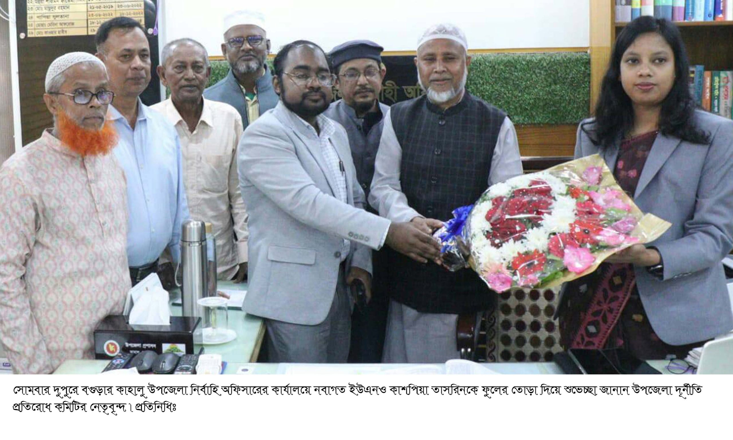 কাহালুর নবাগত ইউএনও কাশপিয়া তাসরিনকে ফুলেল শুভেচ্ছা জানালেন দুর্নীতি প্রতিরোধ কমিটির নেতৃবৃন্দ