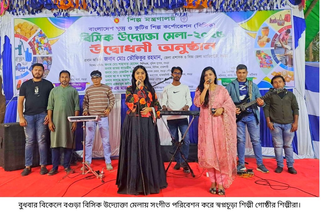 বগুড়া সংবাদ : বগুড়ায় বিসিক জেলা কার্যালয় আয়োজিত ১০ দিনব্যাপী উদ্যোক্তা মেলায় প্রতিদিন দর্শনার্থীদের জন্য মনোজ্ঞ সাংস্কৃতিক অনুষ্ঠান পরিবেশন করছেন জেলার বিভিন্ন সাংস্কৃতিক সংগঠন। বুধবার (১০ ডিসেম্বর) বিকেলে মেলায় সংগীত পরিবেশন করে স্বপ্নচুড়া শিল্পী গোষ্ঠী।