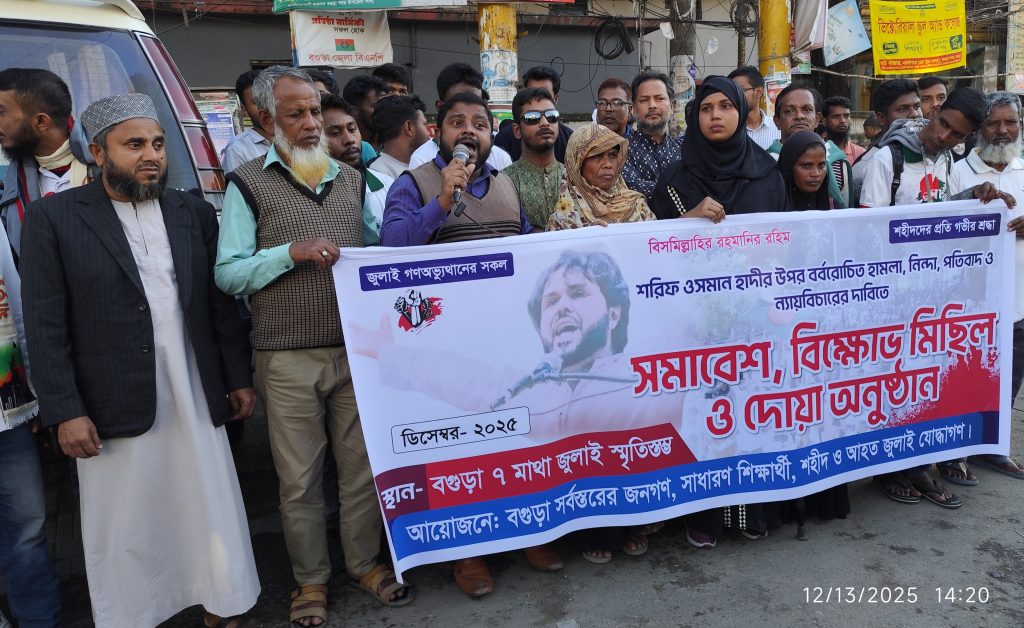 ইনকিলাব মঞ্চের মুখপাত্র শরীফ ওসমান হাদীর ওপর হামলার প্রতিবাদে বগুড়ায় সমাবেশ ও বিক্ষোভ