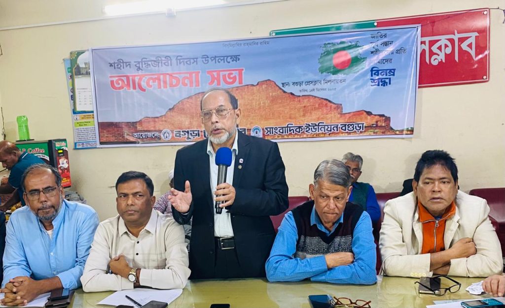 বগুড়া সংবাদ : ১৪ই ডিসেম্বর মহান বুদ্ধিজীবী দিবস উপলক্ষে বগুড়া প্রেসক্লাব মিলনায়তনে আলোচনা সভা অনুষ্ঠিত হযেছে। রোববার সকালে ক্লাবের সভাপতি রেজাউল হাসান রানুর সভাপতিত্বে এ সভা ানুষ্ঠিত হয়।