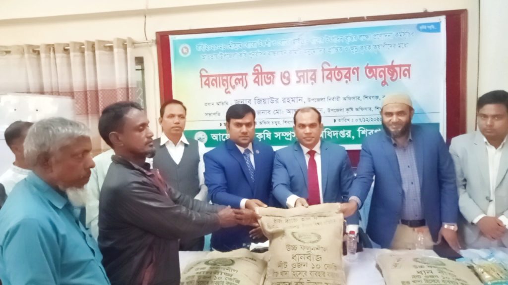 বগুড়া সংবাদ (রশিদুর রহমান রানা ,শিবগঞ্জ ,বগুড়া) : রবি/২০২৫-২৬ মৌসুমে বোরো উফশী ও বোরে হাইব্রিড ধানের উৎপাদন বৃদ্ধির লক্ষ্যে প্রণোদনা কর্মসূচির আওতায় উপজেলা কৃষি পুনর্বাসন বাস্তবায়ন কমিটি অনুমোদিত ১হাজার নয়শত প্রান্তিক ও ক্ষুদ্র কৃষক/কৃষাণীদের বিনামূল্যে বীজ ও সার এবং সাতশত ক্ষুদ্র ও প্রান্তিক কৃষকের মাঝে শুধু বীজ বিতরণ কর্মসূচির শুভ উদ্বোধন করা হয়েছে। সোমবার ( ১৫ ডিসেম্বর )) সকালে উপজেলা কৃষি অফিস চত্বরে কৃষি সম্প্রসারণ অধিদপ্তরের আয়োজনে কৃষক-কৃষাণীদের মাঝে বিনামূল্যে সার ও বীজ বিতরণ কার্যক্রম উদ্বোধন করেন উপজেলা নির্বাহী কর্মকর্তা জিয়াউর রহমান। বিতরণ অনুষ্ঠানে সভাপতিত্ব এবং স্বাগত বক্তব্য প্রদান করেন উপজেলা কৃষি অফিসার আব্দুল হান্নান। এসময় উপস্থিত ছিলেন উপজেলা প্রাণিসম্পদ কর্মকর্তা ডা, মাহবুবুর রহমান, উপজেলা কৃষি সম্প্রসারণ অফিসার রাজিব হাসান, উপজেলা প্রকল্প বাস্তবায়ন কর্মকর্তা জহিরুল ইসলাম কুষকদের মধ্যে মিজানুর রহমান, বাচ্চু