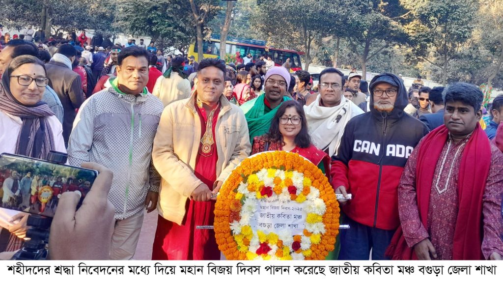 বগুড়া সংবাদ: স্বরচিত কবিতা পাঠ, আলোচনা সভা ও শহীদদের শ্রদ্ধা নিবেদনের মধ্যে দিয়ে মহান বিজয় দিবস পালন করেছে জাতীয় কবিতা মঞ্চ বগুড়া জেলা শাখা। দিবসটি পালনে বিজয় দিবসের সূচনালগ্নে সকাল ৭টায় মুক্তির ফুলবাড়ি বিজয় স্তম্ভে শহীদদের ফুলেল শ্রদ্ধা জানানো হয়। উপস্থিত সংগঠনের কবিদের নিয়ে এক আলোচনা সভার আয়োজন করা হয়। পরে স্বরচিত কবিতা পাঠে অংশগ্রহণ করেন কবিরা। এতে উপস্থিত ছিলেন জাতীয় কবিতা মঞ্চ বগুড়ার সহ সভাপতি জাহাঙ্গীর মাহমুদ, সাধারণ সম্পাদক সাদেকুর রহমান সোহাগ, উপদেষ্টা কবি এইচ আলিম ও ছড়াকার আমির খসরু সেলিম, দপ্তর সম্পাদক প্রীতি দত্ত, সাংগঠনিক সম্পাদক পিংকু আহম্মেদ, নির্বাহী সদস্য আনিছুর রহমান, কবি মরুফা আক্তারসহ অন্যান্য কবিবৃন্দ।