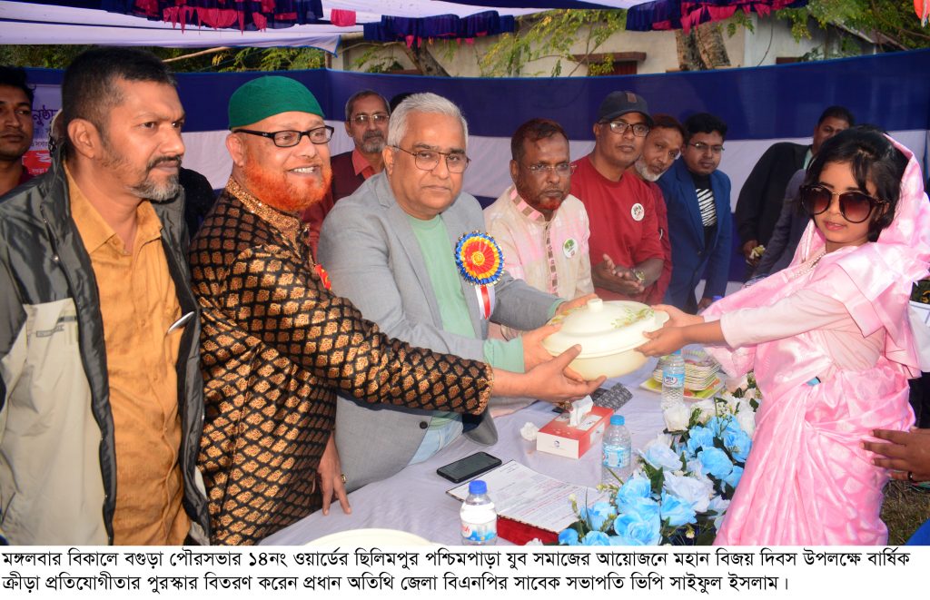 বগুড়া সংবাদ : বগুড়া জেলা বিএনপির সাবেক সভাপতি ভিপি সাইফুল ইসলাম বলেছেন, বাংলাদেশে সকল সেক্টরের খেলাধুলোকে এগিয়ে নিতে কাজ করেছেন বিশিষ্ট ক্রিড়াবিদ ও সংগঠক মরহুম আরাফাত রহমান কোকো। ক্রিকেটকে এগিয়ে নিতে বগুড়ায় আন্তর্জাতিক মানে স্টেডিয়াম নির্মাণ করেছেন। উত্তরবঙ্গের সব জেলার মানুষ শহীদ চান্দু স্টেডিয়ামে আন্তর্জাতিক ক্রিকেট ম্যাচ দেখেছেন। বিএনপি সরকার দেশ পরিচালনার দায়িত্ব পেলে আবারও বগুড়ায় আন্তর্জাতিক খেলা শুরু হবে। মহান বিজয় দিবসে স্বাধীনতার ঘোষক বগুড়ার কৃতি সন্তান শহীদ রাষ্ট্রপতি জিয়াউর রহমানকে শ্রদ্ধার সাথে স্মরণ করছি। তিনি আরো বলেন, আসন্ন জাতীয় সংসদ নির্বাচনে বগুড়া সদর আসনে বিএনপির ভারপ্রাপ্ত চেয়ারম্যান তারেক রহমানকে রেকর্ড সংখ্যক ভোট দিয়ে নির্বাচিত করতে হবে। তারেক রহমান নির্বাচিত হলে উন্নয়ন বঞ্চিত বগুড়ার সকল কাজ শুরু হবে। সদরের মানুষের দায়িত্ব তারেক রহমানকে নির্বাচিত করে দেশের প্রধানমন্ত্রী করতে হবে। ১৬ ডিসেম্বর মঙ্গলবার বিকালে বগুড়া পৌরসভার ১৪নং ওয়ার্ডের ছিলিমপুর পশ্চিমপাড়া যুব সমাজের আয়োজনে মহান বিজয় দিবস উপলক্ষে বার্ষিক ক্রীড়া প্রতিযোগীতার অনুষ্ঠানে প্রধান অতিথির বক্তব্যে উপরোক্ত কথা বলেন। ক্রীড়া প্রতিযোগীতার অনুষ্ঠানে সভাপতিত্ব করেন সংগঠনের সাধারণ সম্পাদক সামিউল ইসলাম আরিফ। এতে বিশেষ অতিথি হিসাবে উপস্থিত ছিলেন ১৪নং ওয়ার্ড বিএনপির সভাপতি সাজ্জাদ হোসেন পিন্টু, শহর স্বেচ্ছাসেবকদলের সাবেক সভাপতি মাহবুব হাসান লেমন, সাবেক সাংগঠনিক সম্পাতক জহুরুল ইসলাম পলাশ, জেলা ছাত্রদলের সহ-সভাপতি সোয়েব ইসলাম অভি, আজিজুল হক কলেজ ছাত্রদলের যুগ্ম আহবায়ক আরিফিন খালিদ, আনোয়ার হোসেন আপেল, ইকরামুল কবির রকি, আব্দুস সালাম মন্ডল, মিজানুর রহমান বাবু, সুজন সরকার, আরিফুল রহমান নাঈম হোসেন, শাজাহান আলী, হায়দার আলী, আশরাফুজ্জামান, সেতু আহমেদ, নাঈম হোসেন, সোহেল উদ্দিন,রাজ্জাক, ঠান্ডু, রেজ্জাক,বাছেদ, আশিক, আল নোমান। ক্রীড়া প্রতিযোগীতার বিভিন্ন ইভেন্টের খেলায় বিজয়ীদের হাতে পুরস্কার তুলেদেন অতিথিরা।