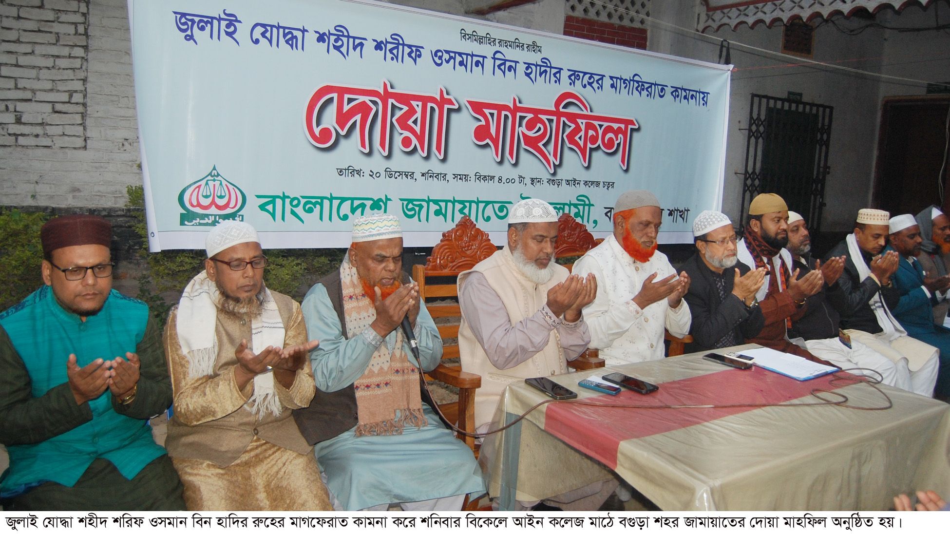 বগুড়া সংবাদ : কেন্দ্রীয় কর্মসুচীর অংশ হিসেবে জুলাই যোদ্ধা ইনকিলাব মঞ্চের মুখপাত্র শহীদ শরিফ ওসমান বিন হাদির রুহের মাগফেরাত কামনা করে শনিবার বিকেলে আইন কলেজ মাঠে বগুড়া শহর জামায়াতের দোয়া মাহফিল অনুষ্ঠিত হয়। নায়েবে আমীর অধ্যাপক মাওলানা আব্দুল হালিম বেগের সভাপতিত্বে মাহফিলে প্রধান অতিথি ছিলেন শহর আমীর অধ্যক্ষ মাওলানা আবিদুর রহমান সোহেল। সহকারী সেক্রেটারী এ্যাডভোকেট আল আমিনের পরিচালনায় মাহফিলে আরো বক্তব্য রাখেন শহর সেক্রেটারী অধ্যাপক আ স ম আব্দুল মালেক, অধ্যাপক রফিকুল আলম, আজগর আলী, মাওলানা হেদায়েতুল ইসলাম, অধ্যাপক আব্দুস সালাম তুহিন, মাওলানা আব্দুল হামিদ বেগ, অধ্যক্ষ ইকবাল হোসেন, মিজানুর রহমান, আজাহার আলী প্রমুখ।