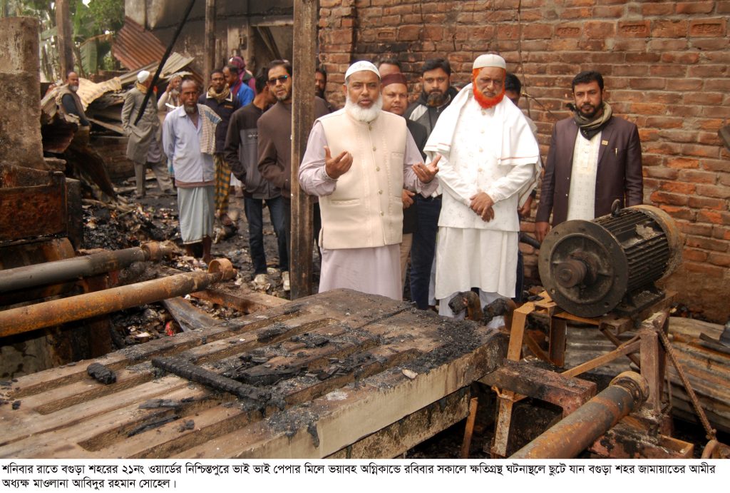 বগুড়া সংবাদ : শনিবার রাতে বগুড়া শহরের ২১নং ওয়ার্ডের নিশ্চিন্তপুরে ভাই ভাই পেপার মিলে ভয়াবহ অগ্নিকান্ড সংঘটিত হয়। আগুনে পেপার মিল পুড়ে ছাই হয়ে যায়। এ ঘটনায় প্রায় ৩০ লক্ষ টাকার ক্ষতি সাধিত হয়। খবর পেয়ে ফাযার সার্ভিস আগুন নিয়ন্ত্রণে আনে। বৈদ্যুতিক শর্ট সার্কিট থেকে আগুনের সুত্রপাত বলে জানা গেছে। এ ঘটনায় পর রবিবার সকালে ঘটনাস্থলে ছুটে যান বগুড়া শহর জামায়াতের আমীর অধ্যক্ষ মাওলানা আবিদুর রহমান সোহেল। তিনি ক্ষতিগ্রস্থ পেপার মিল পরিদর্শন করেন ও পেপার মিলের মালিক আব্দুল হান্নান কে শান্তনা দেন। এ সময় উপস্থিত ছিলেন শহর সেক্রেটারী অধ্যাপক আ স ম আব্দুল মালেক, প্রচার সম্পাদক অধ্যক্ষ ইকবাল হোসেন, আই বি ডাব্লিউ এফ শহর সভাপতি মাহফুজুল হক, ২১ নং ওয়ার্ড আমীর আব্দুস সালাম করিম, মাওলানা আব্দুল জলিল। এ সময় তিনি অসহায় ব্যবসায়ীকে অর্থ সহাসয়তা প্রদান করেন।