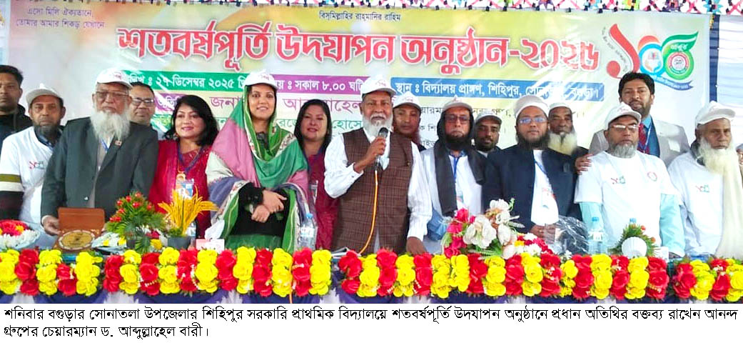 বগুড়া সংবাদ : বগুড়ার সোনাতলায় গতকাল শনিবার শিহিপুর সরকারি প্রাথমিক বিদ্যালয় শতবর্ষপূর্তি উদযাপন অনুষ্ঠান প্রকৌশলী সানাউল হক ডিউয়ের সভাপতিত্বে বিদ্যালয় চত্বরে অনুষ্ঠিত হয়। অনুষ্ঠানে প্রধান অতিথির বক্তব্য রাখেন, অত্র এলাকার কৃতি সন্তান ও আনন্দ গ্রুপের চেয়ারম্যান ড. আব্দুল্লাহেল বারী। প্রধান অতিথির বক্তব্যে তিনি বলেন, এই প্রতিষ্ঠানটি শতবছর ধরে ভাল মানুষ গড়ার অবদান রেখে যাচ্ছে। পাশাপাশি এলাকাটি শিক্ষানগরী এলাকায় পরিণত করতে স্থানীয় সৈয়দ আহম্মদ পরিবারটি ভুমিকা রেখে যাচ্ছেন। আমরা দান করা শিখবো। তাদের মতো আমরা দান করে উদাহরণ সৃষ্টি করবো। একসময় এই শিহিপুর এলাকাটি শহরে পরিণত হবে।