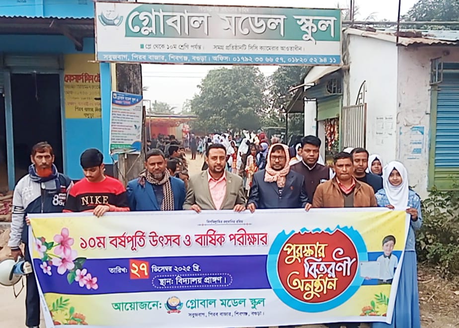ব্যাপক উৎসাহ ও উদ্দীপনার মধ্য দিয়ে বগুড়ার শিবগঞ্জ উপজেলার পিরব ইউনিয়ন সুনামধন্য শিক্ষা প্রতিষ্ঠান গ্লোবাল মডেল স্কুলের ১০তম বর্ষপূতি ও বার্ষিক পরীক্ষার পুরস্কার বিতরণ অনুষ্ঠান অনুষ্ঠিত হয়েছে। এ উপলক্ষে শনিবার ( ২৭ ডিসেম্বর) এক বর্ণাঢ্য শোভাযাত্রা ইউনিয়নের প্রধান প্রধান সড়ক প্রদক্ষিন শেষে স্কুল প্রাঙ্গনে এসে শেষ হয়। এসময় উপস্থিত ছিলেন উপস্থিত ছিলেন বিদ্যালয়ের সহ-সভাপতি আলহাজ্ব আব্দুস সাত্তার, বিদ্যালয়ের প্রতিষ্ঠাতা ও পরিচালক শফিক সরদার, বিদ্যালয় ম্যানেজিং কমিটির সদস্য জনাব মাসুদুর রহমান মাসুদ, প্রধান শিক্ষক শাহজাদা কামাল হাসান, শাহিনুর রহমান ,মাহমুদুল হাসান প্রমূখ।পরে বার্ষিক পরিক্ষার ফলফল ও কৃতি শিক্ষার্থীদের মাঝে পুরস্কার বিতরণ করা হয়।