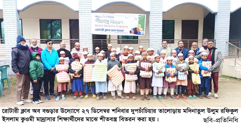 বগুড়া সংবাদ : বগুড়ার দুপচাঁচিয়া উপজেলার তালোড়ায় রোটারী ক্লাব অব বগুড়ার উদ্যোগে মদিনাতুল উলুম রফিকুল ইসলাম ক্বওমী মাদ্রাসার শিক্ষার্থীদের মাঝে শীতবস্ত্র (কম্বল) বিতরণ করা হয়েছে। ২৭ ডিসেম্বর শনিবার সকালে মাদ্রাসা প্রাঙ্গণে শিক্ষার্থীদের মাঝে এ শীতবস্ত্র বিতরণ করেন প্রধান অতিথি শীতবস্ত্র কমিটির চেয়ারম্যান রোটাঃ মনজুর কাদের। এসময় ক্লাব সেক্রেটারী রোটাঃ আলহাজ্ব নবিউল ইসলাম নয়ন, রোটাঃ শফিকুল ইসলাম শফিক, রোটাঃ রফিকুল ইসলাম, রোটাঃ শফিকুল ইসলাম বিপুল, রোটাঃ আব্দুস সামাদ তালুকদার, মাদ্রাসার পরিচালনা কমিটির সভাপতি ও তালোড়া পৌরসভার সাবেক প্যানেল মেয়র আলহাজ্ব মোশারফ হোসেন মুন্সি সেলিম, রোটারী ক্লাবের অফিস সহকারি মোঃ হাবিব উপস্থিত ছিলেন।