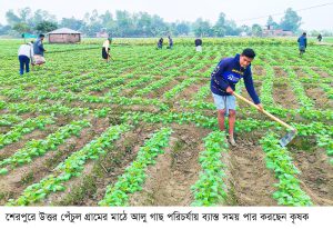 কামাল আহমেদ শেরপুর (বগুড়া) : শেরপুর উপজেলায় এবার আলুর বাম্পার ফলনের আশায় কৃষকরা আলু গাছের পরিচর্যায় ব্যস্ত সময় পার করছেন। উপজেলায় আলুক্ষেতে সকাল থেকে সন্ধ্যা পর্যন্ত কাজ করছেন চাষিরা। সেচ দেওয়া, আগাছা পরিষ্কার, কীটনাশক স্প্রে ও মাটি দিয়ে বেধেঁ দেয়া সহ নানা কাজে ব্যাস্ত সময় পার করছেন শেরপুরের কৃষকেরা। উপজেলা কৃষি সম্প্রসারন অফিস সূত্রে জানা গেছে, চলতি মৌসুমে শেরপুরে লক্ষ্যমাত্রার চেয়ে বেশি জমিতে আলু চাষ হয়েছে। গত বছরে বড় ধরনের লোকসান, এবারে সার সংকট সহ নানা প্রতিকূলতাকে পিছনে ফেলে শেরপুরের কৃষকরা আলুর জমি পরিচর্যায় চাষে ব্যস্ত। সরেজমিনে দেখা যায় উপজেলার কুসুম্বি ইউনিয়নের খিকিন্দা, চন্ডেশ^র, উত্তর পেঁচুল, আকরামপুর, মির্জাপুর ইউনিয়নের মাখাইলচাপড়, তালতাসহ বিভিন্ন গ্রামের পর গ্রাম, একরের পর একর জমিতে শুধু আলুর চাষ। প্রতিদিন কয়েক হাজার পুরুষ শ্রমিক ৭শ থেকে ৮শ টাকা মজুরি ভিত্তিতে এই কাজগুলো কাজ করছেন। অপরদিকে এই উপজেলার যারা আগাম আলু চাষ করেছিলেন তারা বাজারজাতের জন্য জমি থেকে আলু উত্তোলন করছেন, তবে তারা দাম নিয়ে একেবারেই হতাশ হয়ে পড়েছেন। আগাম আলু চাষ করা কৃষক আমজাদ বলেন, গত বছরের লোকসান কাটিয়ে উঠতে এবার ২ বিঘা জমিতে আগাম আলু রোপন করেছিলাম কিন্তু দাম পড়ে যাওয়ায় এবারো লোকসানের মুখোমুখি হতে হচ্ছে। পাইকারি বাজারে বর্তমানে নতুন আলু ৩০/৪০ টাকা কেজি দরে বিক্রি করতে হচ্ছে। উপজেলা কৃষি সম্প্রসারণ অফিস সূত্রে জানা যায়, এ বছর আলু চাষের লক্ষ্যমাত্রা নির্ধারণ করা হয়েছে ২ হাজার ৫শ হেক্টর জমি কিন্তু বাস্তবে এর চাইতে অনেক বেশি পরিমান জমিতে আলুর চাষ হয়েছে। মির্জাপুর ইউনিয়নের মাধাইল চাপড় গ্রামের কৃষক জাহাঙ্গীর হোসেন বলেন, গত বছর ১শ ৫০ বিঘা জমিতে আলু চাষ করে প্রায় ৭০ লাখ টাকা লোকসান হয়েছে, আশা করছি এবার সেই লোকসান পুষিয়ে উঠবে। তবে আশংকায় আছি আলুর দাম নিয়ে, কেননা এবারে আগাম জাতের নতুন আলুর দাম পড়ে গেছে। উপজেলার কুসুম্বি ইউনয়নের উত্তর পেঁচুল গ্রামের কৃষক জেল হক, ফরিদ হোসেন , খিকিন্দা গ্রামের ফারুক হোসেন বলেন, আমরা একেকজন ১০ থেকে ২৫ বিঘা আলুর চাষ করেছি। এখন গাছ পরিচর্যায় ব্যস্ত সময় যাচ্ছে। আশা করছি এবার আলুম দাম প্রত্যাশিত থাকবে। অন্যান্য ফসলের চাইতে তুলনামুলক আলু লাভবেশি। এক একর জমিতে আলু বীজ ক্রয়, রোপন, সার প্রয়োগ, সেচ ও শ্রমিকসহ খরচ হয় ১ লাখ ৫০ হাজার টাকা থেকে ১ লাখ ৮০ হাজার টাকা খরচ হয়। বাজারে আলুর দাম স্বাভাবিক থাকলে খরচ বাদ দিয়ে একর প্রতি ৭০ হাজার থেকে ৮০ হাজার টাকা লাভ হয়। গত বছর আলুচাষ করে ক্ষতিগ্রন্থ হলেও আশা করছি এবার ভাল দামে বিক্রি করতে পারবো। এখন গাছের যে চেহারা তাতে আবহাওয়া অনুকুলে থাকলে বাম্পার ফলন পা