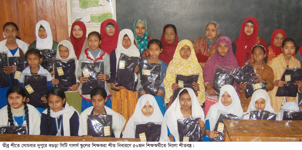বগুড়া সংবাদ : বগুড়া সহ উত্তরাঞ্চলে তীব্র শীতে কাপছে শিক্ষার্থীরা। শিক্ষার্থীদের শীত নিবারণে সোমবার দুপুরে বগুড়া সিটি গালর্স স্কুলের শিক্ষকরা ৫০জন শিক্ষার্থীতে দিলো শীতবস্ত্র দিলো শিক্ষক শিক্ষিকারা। এ সময় উপস্থিত ছিলেন স্কুলের প্রধান শিক্ষাক মোশাররফ হোসেন, রাজু আহম্মেদ সহ শিক্ষক শিক্ষিকাবৃন্দ। প্রধান শিক্ষক মোশাররফ হোসেন জানান, শীতে অনেক অসহায় শিক্ষার্থীকে কাঁপতে দেখে আমরা শিক্ষকরা কিছু সহায়তা দিয়ে আমরা এ কাজটি করেছি।