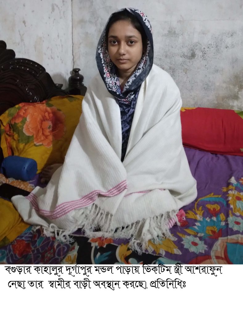গত ২৮/১২/২০২৫ইং তারিখে তারা পালিয়ে গিয়ে আবার বিবাহ বন্ধনে আবদ্ধ হন। এ ঘটনা মেনে নিতে না পারায় গত ৩১/১২/২০২৫ইং তারিখে আশরাফুন নেছার মা রোকেয়া বেগম বাদী হয়ে কাহালু থানায় পলাশকে আসামী করে নারী ও শিশু নির্যাতন দমন আইনে অপহরন মামলা দায়ের করেন। কাহালু থানা পুলিশ ঐ দিনেই নন্দীগ্রাম উপজেলার বর্ষন বাজারে পলাশের নানার বাড়ী থেকে পলাশকে গ্রেফতার করেন এবং আশরাফুন নেছাকে থানায় নিয়ে আসেন। থানা পুলিশ পলাশকে আদালতে এবং ভিকটিম আশরাফুন নেছাকে আদালতে জবানবন্দী ও ডাক্তরী পরীক্ষার জন্য প্রেরন করেন।