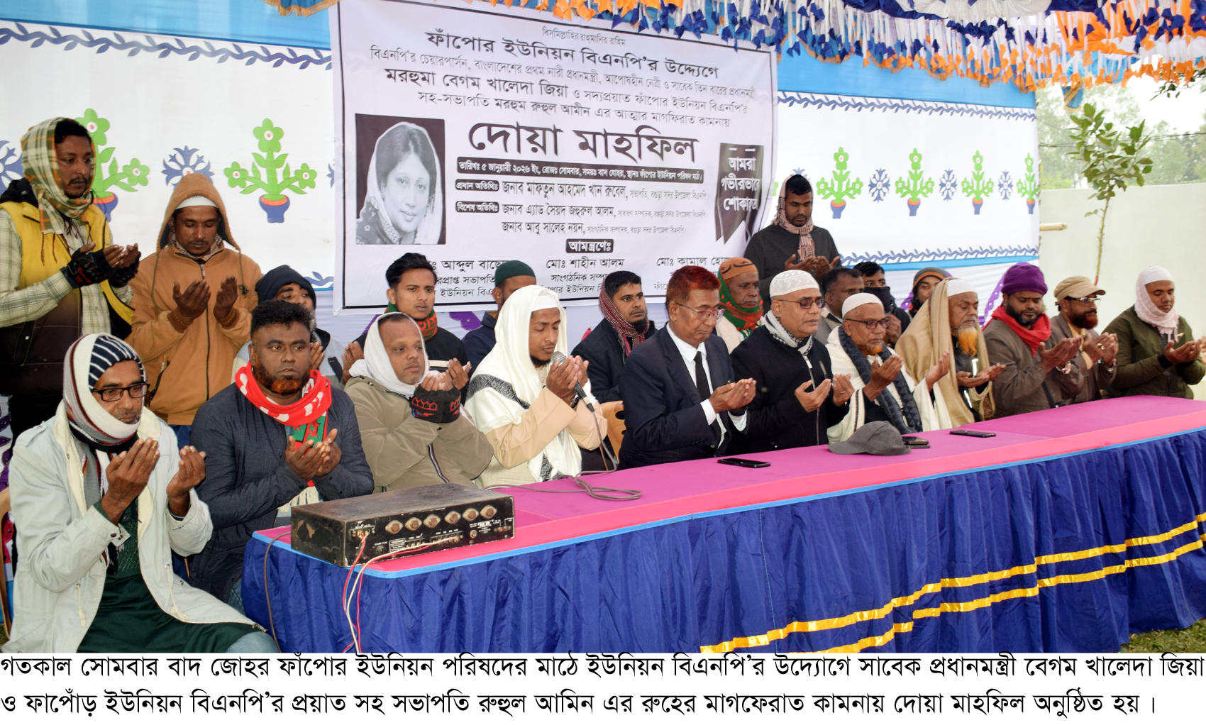 দোয়া মাহফিলে প্রধান অতিথি হিসেবে উপস্থিত ছিলেন বগুড়া জেলা বিএনপির সহ সভাপতি ও সদর উপজেলা বিএনপির সভাপতি জনাব মাফতুন আহমেদ খান রুবেল। বিশেষ অতিথি হিসেবে উপস্থিত ছিলেন বগুড়া জেলা বিএনপির আইন বিষয়ক সম্পাদক ও সদর উপজেলা বিএনপির সাধারণ সম্পাদক জনাব এ্যাড. সৈয়দ জহুরুল আলম এবং প্রচার সম্পাদক আল আমিন পেস্তা, সহ প্রচার সম্পাদক জনাব আতাউর রহমান মিঠু । আমন্ত্রিত অতিথি হিসেবে ছিলেন ফাপোর ইউনিয়ন পরিষদের চেয়ারম্যান আবু রায়হান। অনুষ্ঠানে বক্তারা বলেন, দেশনেত্রী বেগম খালেদা জিয়া গনতন্ত্র পুনরুদ্ধার সারা জীবন সংগ্রাম করছেন। এজন্য তিনি কারাবরণ করেছেন এবং কখনও পিছুপা হননি। সেজন্য দেশবাসীকে তাঁর রুহের মাগফেরাত কামনা করার জন্য আহ্বান জানান। দোয়া মাহফিলে সভাপতিত্ব করেন ফাঁপোর ইউনিয়ন বিএনপির ভারপ্রাপ্ত সভাপতি মো. আব্দুল বাছেদ। অনুষ্ঠান সঞ্চালনা করেন ফাঁপোর ইউনিয়ন বিএনপির সাংগঠনিক সম্পাদক মো. শাহীন আলম। সার্বিক ব্যবস্থাপনায় ছিলেন সাধারণ সম্পাদক এ্যাডঃ মো. কামাল হোসেন।