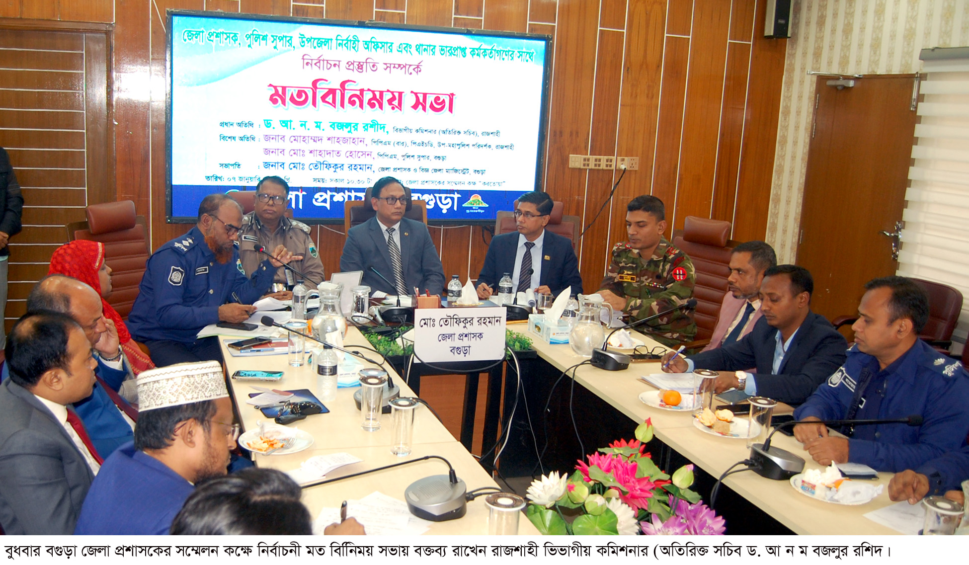 বগুড়া সংবাদ : বুধবার সকালে জেলা প্রশাসকের সম্মেলন কক্ষ করতোয়ায় বগুড়া জেলার জেলা প্রশাসক, পুলিশ সুপার, উপজেলা নির্বাহী অফিসার ও থানার ভারপ্রাপ্ত কর্মকর্তাগণের সাথে আসন্ন ত্রয়োদশ জাতীয় সংসদ নির্বাচন ও গণভোট এর প্রস্তুতি সম্পর্কে মতবিনিময় সভা অনুষ্ঠিত হয়। উক্ত সভায় বগুড়া জেলার জেলা প্রশাসক ও জেলা ম্যাজিস্ট্রেট তৌফিকুর রহমান সভাপতিত্বে প্রধান অতিথি হিসেবে উপস্থিত ছিলেন রাজশাহী বিভাগের বিভাগীয় কমিশনার ড.আ.ন.ম বজলুর রশিদ বলেন আসন্ন ত্রয়োদশ জাতীয় সংসদ নির্বাচনকে সুষ্ঠ ও নিরপেক্ষ করতে সরকারের উর্ধতন কর্মকর্তা সহ জেলা প্রশাসন পুলিশ প্রশাসনকে জনগণের সাঝে আস্থা ফিরিয়ে আনতে হবে। যে কোন মূল্যে এই নির্বাচনে প্রশসনের পক্ষপাতিত্ত কোন কর্মকর্তা জড়িত থাকলে তার বিরুদ্ধে যথাযথ ব্যবস্থা নেওয়া হবে। অন্যান্যদের মধ্যে বক্তব্য রাখেন বিশেষ অতিথি রাজশাহী বিভাগের উপ-মহাপুলিশ পরিদর্শক মোহাম্মদ শাহজাহান, পিপিএম (বার),পিএইচডি মহোদয় এবং বগুড়া জেলার পুলিশ সুপার শাহাদাত হোসেন, পিপিএম সহ প্রমুখ।