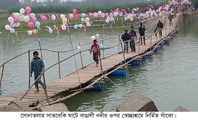 বগুড়া সংবাদ : মোশাররফ হোসেন মজনু: এলাকাবাসীর স্বেচ্ছাশ্রম আর অর্থ ব্যয়ে সোনাতলা উপজেলার পাকুল্লা ইউনিয়নের সাতবেকি খেয়াঘাটে বাঙালী নদীর ওপর ৩০০ মিটার দৈর্ঘ্যে বাঁশ ও ড্রাম দিয়ে নির্মিত হলো একটি সাঁকো। সাঁকোটি নির্মাণে নদী পাড়াপাড়ে লাঘব হলো জনদুর্ভোগ। স্বস্তির নিঃশ্বাস ফেললো নদীর দু’পাড়ের মানুষজন। এখানে পানি থাকে বছরের বারোটি মাস। নদী পাড়াপাড় একমাত্র ভরসা ডিঙ্গি নৌকা। এ ঘাটে ডিঙ্গি নৌকাযোগে সাতবেকি,মোনারপটল,উত্তর করমজা,হরিখালী,হাঁসরাজ,দড়ি হাঁসরাজ, বেড়াডাঙ্গা হাঁসরাজ, পশ্চিম তেকানী,পূর্ব তেকানী,পশ্চিম পদ্মপাড়া, শিচারপাড়া,খিতারেরপাড়া ও রংরারপাড়া-সহ বিভিন্ন এলাকার শত শত মানুষ প্রতি নিয়ত জীবনের ঝুঁকি নিয়ে এপাড়-ওপাড় যাতায়াত করে। নদীর পূর্ব পাশে রয়েছে সাতবেকি সরকারি প্রাথমিক বিদ্যালয়-সহ কয়েকটি শিক্ষা প্রতিষ্ঠান,হাট-বাজার,ইউনিয়ন পরিষদ,পোস্ট অফিস, অনেক ফসলী জমি ও ব্যবসা প্রতিষ্ঠান। এদিকে নদীর পশ্চিম পাশে রয়েছে ৩টি আবাসন প্রকল্প (কথিত গুচ্ছগ্রাম),ভেলুরপাড়ায় অবস্থিত রেলস্টেশন,ডক্টর এনামুল হক ডিগ্রি কলেজ-সহ কয়েকটি শিক্ষা প্রতিষ্ঠান,ব্যাংক,এনজিও,হাট-বাজারসহ অনেক ব্যবসা প্রতিষ্ঠান। রয়েছে অনেক ফসলি জমি। এ ঘাটে ব্রীজ না থাকায় অনেক ক্ষেত্রে সঠিক সময়ে পৌঁছা সম্ভব হয় না। নৌকাযোগে পাড়াপাড় হতে গিয়ে ইতিপূর্বে নৌকা ডুবির ঘটনাও ঘটেছে। এসব থেকে পরিত্রাণ পেতে ও এপাড়-ওপাড় যাতায়াতের সুবিধার্থে ঘাটের দু’পাড়ের যুব সমাজ প্রায় আড়াই মাস আগে এখানে একটি সাঁকো নির্মাণের সিদ্ধান্ত নেন। তাদের এ সিদ্ধান্তে এলাকার জনসাধারণ সমর্থন ও সহযোগিতা করার আশ্বাস দেন। এর প্রেক্ষিতে পাকুল্লা ইউনিয়নের ১নং ওয়ার্ডের সাবেক মেম্বর আমিরুল ইসলাম,যুবকদের মধ্যে শিমুল,রিতু,সাদিক ও আব্দুর রাজ্জাক-সহ অনেকে টাকা,বাঁশ,ড্রাম,লোহা ইত্যাদি সংগ্রহ করে বাঙালী নদীর ওপর সাতবেকি খেয়াঘাটে প্রায় ৩০০ ফুট দৈর্ঘ্যে একটি সাঁকো নির্মাণ করেন। সাঁকোটি নির্মাণ করতে সময় লেগেছে আড়াই মাস। ব্যয় হয়েছে দেড় লক্ষাধিক টাকা। পরিপূর্ণ সাঁকো নির্মাণ হওয়ার পর গত মঙ্গলবার বিকেলে ফিতা কেটে সাঁকোর উদ্বোধন করেন স্থানীয়রা। ফলে সাঁকোর ওপর দিয়ে শুরু হলো যাতায়াত। সৌন্দর্য ফুটে তুলতে সাঁকোর ওপর দিয়ে এপাড়-ওপাড় পর্যন্ত লটকানো হয় নানা রঙের বেলুন। সাঁকোটি দেখার জন্য দুই পাড়ে নদীর তীরে উপস্থিত হয় নানা বয়সের বিভিন্ন এলাকার অনেক নর-নারী। অনেকে শখ করে নবনির্মিত সাঁকোর ওপর দিয়ে যাতায়াত করেন। দর্শনার্থীরা উদ্যোক্তাদের ধন্যবান দেন। কিন্তু এ সাঁকো নির্মাণ করাই শেষ কথা নয়। সাঁকোটি হয়তো বর্ষাকালে বন্যার পানির ¯্রােতে ভেঙ্গে ভেসে যেতে পারে। এতে আবারো 