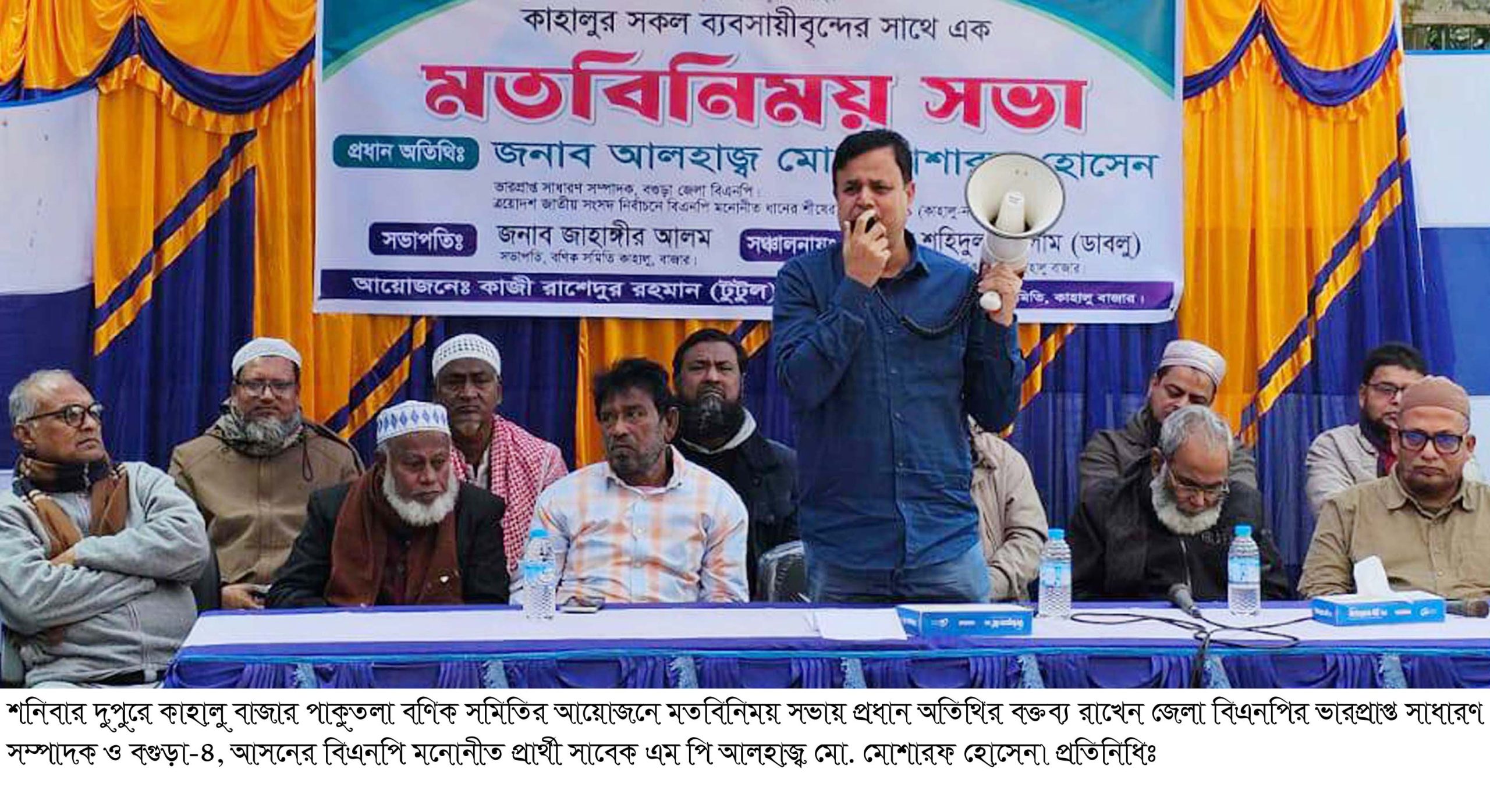 কাহালু বাজার বণিক সমিতির সাধারণ সম্পাদক শহিদুল ইসলাম ডাবলুর সঞ্চালনায় মতবিনিময় সভায় বক্তব্য রাখেন কাহালু উপজেলা বিএনপির ভারপ্রাপ্ত সভাপতি ও সাবেক পৌর মেয়র আলহাজ্ব মো. আব্দুল মান্নান, পৌর বিএনপির সভাপতি আনিছার রহমান আনিছ, উপজেলা বিএনপির সাধারণ সম্পাদক তোফাজ্জল হোসেন আজাদ, পৌর বিএনপির সাধারণ সম্পাদক প্রভাষক হাফিজার রহমান বাবু, সাংগঠনিক সম্পাদক মোহাম্মদ আলী ভূইয়া, উপজেলা বিএনপির সাংগঠনিক সম্পাদক আলহাজ্ব আব্দুল করিম, পৌর বিএনপির সাংগঠনিক সম্পাদক প্রভাষক মো. শাহাবুদ্দিন, ব্যবসায়ীদের মধ্যে বক্তব্য আবুল মনসুর খান, আনছার আলী, ফারাবা আল ফারাবী, নন্দ গোপাল সাহ, আলহাজ্ব মোফাজ্জল হোসেন, আব্দুর রশিদ প্রমূখ।