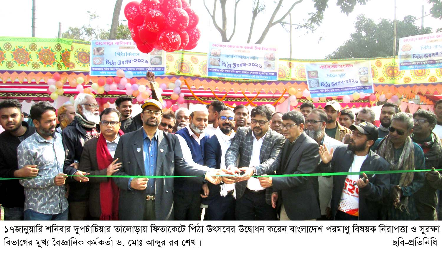 বগুড়া সংবাদ : দুপচাঁচিয়া উপজেলার তালোড়ায় শহীদ লিটন স্মৃতি সংসদের আয়োজনে ও তালোড়া আলতাফ আলী উচ্চ বিদ্যালয়ের সার্বিক তত্বাবধানে দিনব্যাপী নানা আয়োজনের মধ্য দিয়ে পিঠা উৎসবের উদ্বোধন করা হয়েছে। আয়োজনের মধ্য ছিল পিঠা উৎসব, চিত্রাংকণ প্রতিযোগিতা, কৃতি শিক্ষার্থীদের সংবর্ধনা, প্রতিভা অন্বেষনের প্রতিযোগিতা ও কর্মসংস্থান নিয়ে উন্মুক্ত আলোচনা সভা। এ উপলক্ষে ১৭জানুয়ারি শনিবার বেলা ১১টায় তালোড়া আলতাফ আলী উচ্চ বিদ্যালয় মাঠে ফিতা কেটে পিঠা উৎসবের আনুষ্ঠানিকভাবে উদ্বোধন করেন অত্র বিদ্যালয়ের কৃতি শিক্ষার্থী ও বাংলাদেশ পরমাণু বিষয়ক নিরাপত্তা ও সুরক্ষা বিভাগের মুখ্য বৈজ্ঞানিক কর্মকর্তা ড. মোঃ আব্দুর রব শেখ। উদ্বোধন শেষে অতিথিবৃন্দ পিঠার স্টল পরিদর্শন করেন। পরে অত্র বিদ্যালয়ের প্রধান শিক্ষক সামছুল ইসলাম টুটুল এর সভাপতিত্বে ও সংসদের সদস্য সচিব নিয়ামুল হক এবং অত্র বিদ্যালয়ের প্রাক্তন ছাত্র রাশেদুল আলম অরভিল এর পরিচালনায় আলোচনা সভায় উদ্বোধক ছাড়াও বক্তব্য রাখেন তালোড়া পৌর বিএনপির সাবেক সভাপতি আবু হোসেন সরকার আবুল, তালোড়া পৌরসভার সাবেক প্যানেল মেয়র আলহাজ্ব মোশারফ হোসেন মুন্সি সেলিম, সংসদের সভাপতি আল মুত্তাকিন মুরাদ, তালোড়া পৌর ছাত্রদলের সাধারণ সম্পাদক আল রাফি প্রমুখ। সভা শেষে কৃতি শিক্ষার্থীদের ক্রেস্ট ও চিত্রাংকণ প্রতিযোগিতায় বিজয়ীদের মাঝে পুরস্কার বিতরণ করেন অতিথিবৃন্দ। সন্ধ্যায় এক মনোজ্ঞ ব্যান্ড সংগীত পরিবেশিত হয়।