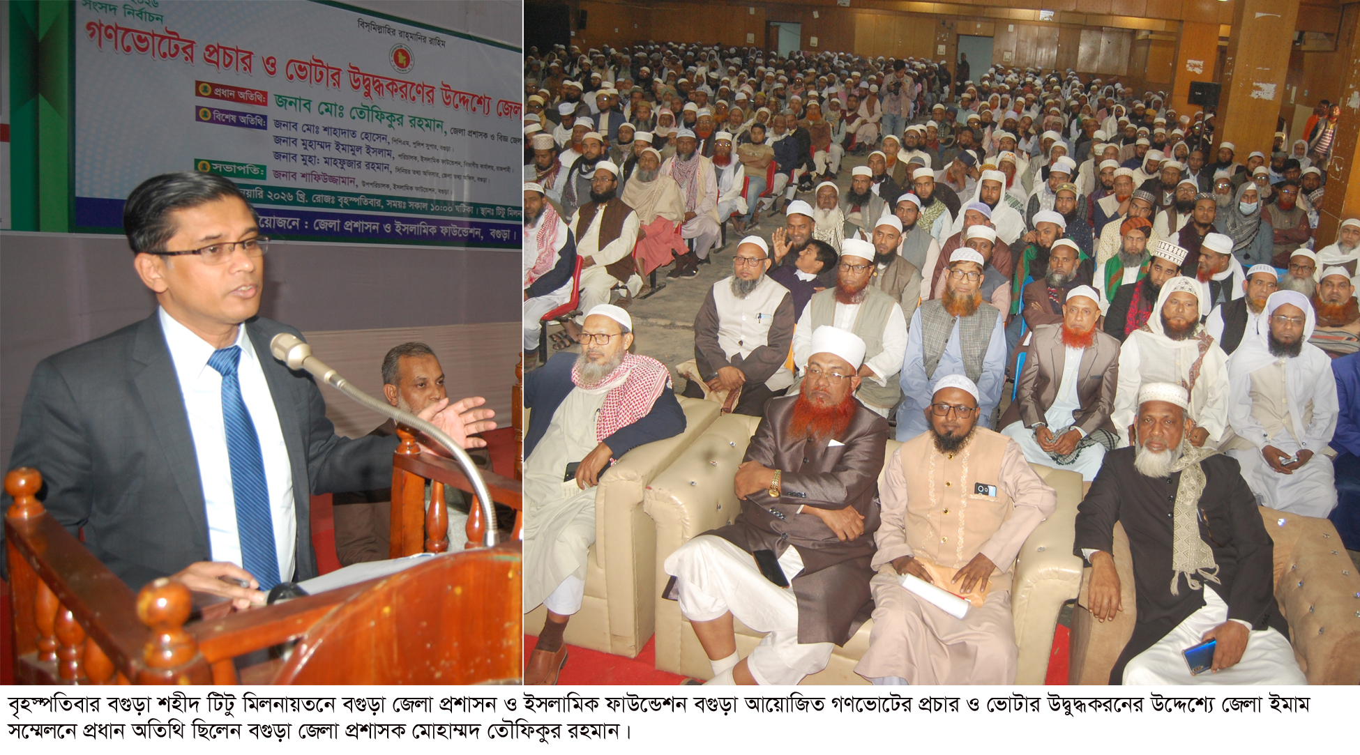 বগুড়া সংবাদ : বৃহস্পতিবার বগুড়া শহীদ টিটু মিলনায়তনে বগুড়া জেলা প্রশাসন ও ইসলামিক ফাউন্ডেশন বগুড়া আয়োজিত গণভোটের প্রচার ও ভোটার উদ্বুদ্ধকরনের উদ্দেশ্যে জেলা ইমাম সম্মেলন ইসলামিক ফাউন্ডেশন বগুড়ার উপ পরিচালক শাফিউজ্জামানের সভাপতিত্বে অনুষ্ঠিত হয়। অনুষ্ঠানে প্রধান অতিথি ছিলেন বগুড়া জেলা প্রশাসক ও বিজ্ঞ জেলা ম্যাজিস্ট্রেট মোহাম্মদ তৌফিকুর রহমান। বিশেষ অতিথি ছিলেন বগুড়া পুলিশ সুপার শাহাদাত হোসেন পিপিএম, ইসলামিক ফাউন্ডেশনের পরিচালক মোহাম্মদ ইমামুল ইসলাম, বগুড়া জেলা সিনিয়ার তথ্য অফিসার মাহফুজার রহমান। বক্তারা বলেন দেশের চাবি আপনার হাতে। ইমামদের বলেন সমাজের বৈষম্য দুর করতে নির্বাচনে হ্যাঁ ভোট দিতে সকল মসজিদে প্রচারণা চালানোর জন্য সকলের প্রতি আহবান জানান।