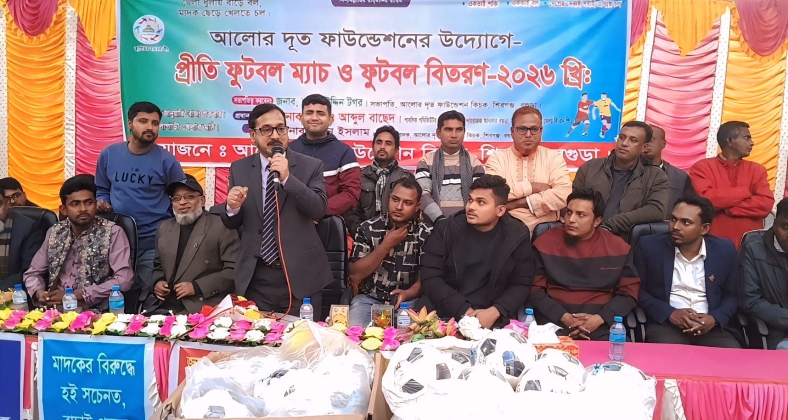 খেলা ধুলায় বাড়ে বল, মাদক ছেড়ে খেলতে চল এই প্রতিপাদ্য সামনে রেখে সামাজিক সেচ্ছাসেবী সংগঠন আলোর দূত ফাউন্ডেশনের আয়োজনে বগুড়ার শিবগঞ্জ উপজেলার কিচক ইউনিয়নের শোলাগাড়ী প্রাথমিক ও আদর্শ উচ্চ বিদ্যালয় মাঠে ফুটবল বিতরণ ও প্রীতি ফুটবল ফাইনাল খেলা অনুষ্ঠিত হয়। শুক্রবার ( ২৩ জানুয়ারি) বিকালে আলোর দূত ফাউন্ডেশন সভাপতি শামস উদ্দিন টগর এর সভাপতিত্বে আয়োজিত অনুষ্ঠানে প্রধান অতিথি হিসাবে উপস্থিত ছিলেন বগুড়া জেলা বিএনপির সহ-সভাপতি ও জেলা দায়রা জাজ আদালতের পিপি অ্যাডভোকেট আব্দুল বাছেদ। বিশেষ অতিথি হিসেবে উপস্থিত ছিলেন বগুড়া জেলা বিএনপির ৩নং ওয়ার্ড সভাপতি ডালু, উপজেলা বিএনপির আইন বিষয়ক সম্পাদক আমিনুল ইসলাম, উপজেলা স্বেচ্ছাসেবী এ্যাসোসিয়শনের সভাপতি সাংবাদিক রশিদুর রহমান রানা, উপজেলা ছাত্রদলের সাধারণ সম্পাদক মীর মুন, উপজেলা স্বেচ্ছাসেবী এ্যাসোসিয়শনের সাধারণ সম্পাদক আরিফুল ইসলাম, সাংগঠনিক সম্পাদক আব্দুল হালিম। আলোর দৃত ফাউন্ডেশনের প্রতিষ্ঠাতা শরিুফুল ইসলাম এর সার্বিত তত্ত্বাবধানে এসময় উপস্থিত ছিলেন বগুড়া জেলা ছাত্রদলের সাবেক কার্যনির্বাহী সদস্য এডভোকেট আরিফ, আমিরুল ইসলাম, আব্দুল মোমিন (নাইম), জাহিদ হাসান, জিল্লুর রহমান, আশরাফুল ইসলাম, আইনুর, জুয়েল সহ প্রমুখ। খেলা শেষে বিজয়ী চাম্পিয়ন দলের হাতে প্রধান অতিথি একটি ছাগল পুরস্কার তুলে দেওয়া হয়। রানারআপ দলকে একটি রাজহাঁস প্রদান করা হয়। পরে ইউনিয়নের প্রতিটি পাড়ায় ক্ষুদে খেলোয়াড়দের মাঝে শতাধিক ফুটবল বিতরণ করা হয়েছে।