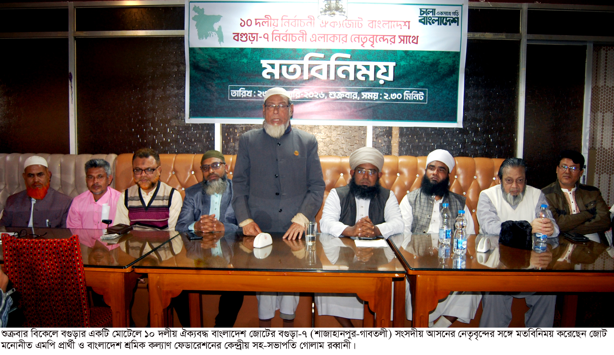 বগুড়া সংবাদ : ১০ দলীয় ঐক্যবদ্ধ বাংলাদেশ জোটের বগুড়া-৭ (শাজাহানপুর–গাবতলী) সংসদীয় আসনের নেতৃবৃন্দের সঙ্গে মতবিনিময় করেছেন জোট মনোনীত এমপি প্রার্থী ও বাংলাদেশ শ্রমিক কল্যাণ ফেডারেশনের কেন্দ্রীয় সহ-সভাপতি গোলাম রব্বানী। শুক্রবার বিকেলে শহরের একটি হোটেলে এ মতবিনিময় সভা অনুষ্ঠিত হয়। মতবিনিময় সভায় গোলাম রব্বানী বলেন, একটি সুষ্ঠু, অবাধ ও গ্রহণযোগ্য নির্বাচন নিশ্চিত করতে হলে সরকার ও প্রশাসনকে অবশ্যই নিরপেক্ষ ভূমিকা পালন করতে হবে। একই সঙ্গে নির্বাচনী আচরণবিধি কঠোরভাবে বাস্তবায়ন নিশ্চিত করতে হবে। তিনি অভিযোগ করে বলেন, নির্বাচন বানচাল করার উদ্দেশ্যে বিভিন্নভাবে হুমকি ও চাপ সৃষ্টি করা হচ্ছে। তবে জামায়াতে ইসলামী এসব হুমকিকে তোয়াক্কা করে না। তিনি আরও বলেন, জামায়াতে ইসলামী ক্ষমতায় গেলে মানুষের মৌলিক অধিকার নিশ্চিত করা হবে এবং একটি ন্যায়ভিত্তিক সমাজ প্রতিষ্ঠা করা হবে। ঐক্যবদ্ধ বাংলাদেশ জোটের পক্ষ থেকে বগুড়া-৭ আসনে তাকে প্রার্থী হিসেবে ঘোষণা করায় তিনি জোটের নেতৃবৃন্দের প্রতি কৃতজ্ঞতা প্রকাশ করেন এবং নির্বাচনে বিজয়ী হতে সবার সর্বাত্মক সহযোগিতা কামনা করেন।সভায় উপস্থিত ছিলেন বগুড়া জেলা জামায়াতে ইসলামীর নায়েবে আমীর অধ্যাপক মাওলানা আব্দুল হাকিম সরকার, বাংলাদেশ শ্রমিক কল্যাণ ফেডারেশনের কেন্দ্রীয় সহ-সভাপতি অধ্যাপক আব্দুল মতিন, বগুড়া জেলা এলডিপির সভাপতি অ্যাডভোকেট মোকলেছুর রহমান, বগুড়া জেলা এনসিপির আহ্বায়ক এম.এস. এ মাহমুদ, বগুড়া জেলা খেলাফত মজলিসের সভাপতি মাওলানা মামুন রহমানী, বগুড়া জেলা এবি পার্টির সভাপতি গোলাম রহমান রয়েল, বগুড়া জেলা বিডিপির সভাপতি মাহফুজুল হক, শাজাহানপুর উপজেলা জামায়াতের আমীর মাওলানা আব্দুর রহমান, সেক্রেটারি মাওলানা শহিদুল ইসলাম, শাজাহানপুর উপজেলা এনসিপির আহ্বায়ক হুমায়ূন কবির হিমু, জেলা জামায়াতে ইউনিট সদস্য মাওলানা আবু বকর সিদ্দিকসহ ১০ দলীয় ঐক্যবদ্ধ বাংলাদেশ জোটের বিভিন্ন পর্যায়ের নেতৃবৃন্দ। মতবিনিময় সভায় উপস্থিত নেতৃবৃন্দ আগামী জাতীয় সংসদ নির্বাচনে বগুড়া-৭ আসনে ঐক্যবদ্ধ বাংলাদেশ জোটের মনোনীত প্রার্থী গোলাম রব্বানীকে বিজয়ী করতে ঐক্যবদ্ধভাবে কাজ করার অঙ্গীকার ব্যক্ত করেন।