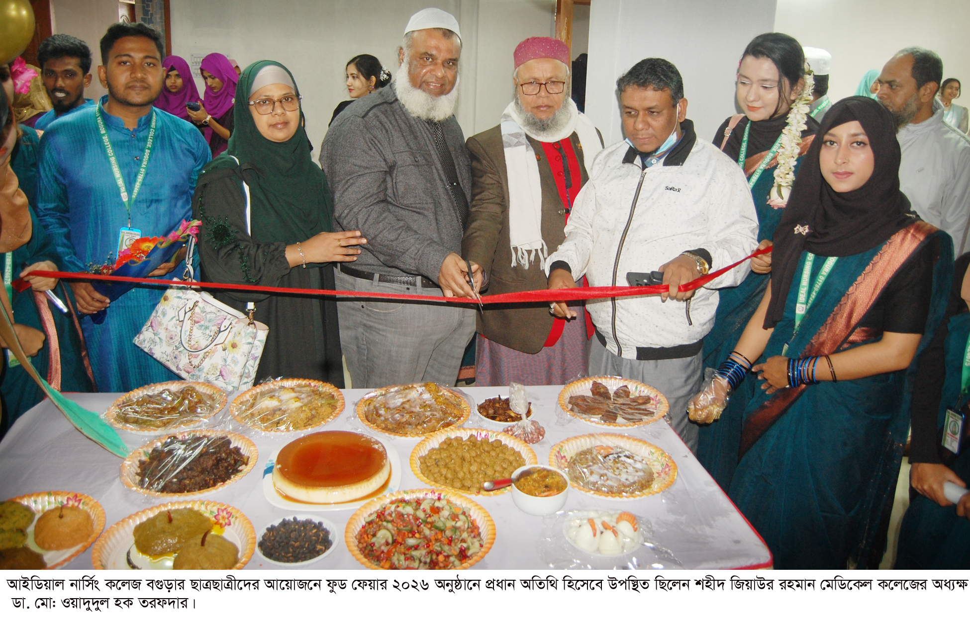 বগুড়া সংবাদ : আইডিয়াল নার্সিং কলেজ বগুড়ার ছাত্রছাত্রীদের আয়োজনে ফুড ফেয়ার ২০২৬ অনুষ্ঠান শনিবার সকালে অধ্যক্ষ মোঃ মনজুর হোসেনের সভাপতিত্বে প্রতিষ্ঠানের হল রুমে অনুষ্ঠিত হয়। অনুষ্ঠানে প্রধান অতিথি হিসেবে উপস্থিত ছিলেন শহীদ জিয়াউর রহমান মেডিকেল কলেজের অধ্যক্ষ ডা. মো: ওয়াদুদুল হক তরফদার। বিশেষ অতিথি  হিসেবে উপস্থিত ছিলেন বগুড়া জেলা শিক্ষা অফিসার মো: রমজান আলী আকন্দ, আইডিয়াল গ্রুপের চেয়ারম্যান আলাউদ্দিন সরকার, প্রতিষ্ঠানের পরিচালক সেলিম রেজা, পরিচালক প্রশাসন মোহাম্মদ আলমগীর হোসাইন, পরিচালনা পরিষদেরর সদস্য জুলফিকার আলী বাবু। প্রধান অতিথি প্রতিষ্ঠানের শিক্ষার্থীদের পুষ্টি সমৃদ্ধ ফুড ফেযারের প্রশংসা করেন এবং মানবতার কল্যানে কাজ করার আহবান জানান।
