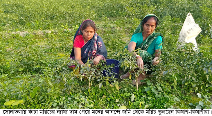 বগুড়া সংবাদ (মোশাররফ হোসেন মজনু, সোনাতলা): মরিচ উৎপাদনের জন্য খ্যাত বগুড়ার সোনাতলা। প্রতি বছরের মতো এবারো মরিচের আবাদে ছেয়ে গেছে সোনাতলার সর্বত্রে। বিশেষ করে তেকানী চুকাই নগর ও পাকুল্লা ইউনিয়নের যমুনার চরাঞ্চলে। এ সব ইউনিয়নের চরাঞ্চল ছাড়াও জোড়গাছা ও মধুপুর ইউনিয়নের সমতল জমিগুলোতেও মরিচের ফলন ভালো হয়েছে। মৌসুমের প্রথম দিকে যেসব কৃষক যথাযথভাবে পরিচর্যা করতে পারেনি তাদের মরিচ গাছে দেখা দেয় নানা রোগবালাই। মারা গেছে অনেকের জমির মরিচ গাছ। অনেকে ক্ষতি হওয়া জমিতে আবারো মরিচ চাষ করেন। এতে তেমন ফল পায়নি। ফলে আর্থিকভাবে চরম ক্ষতিগ্রস্ত হয়ে মাথায় হাত দিয়ে বসেছেন। মরিচ চাষীদের একটি অংশ। ক্ষতিগ্রস্ত মরিচ চাষীদের অনেকে বলেছেন সঠিক সময়ে জমি চাষ,বীজ বোপন,রোপন,সার,কীটনাশক ওষুধ প্রয়োগ ও পানি সেচ দেয়া হয়েছে। তারপরও মরিচ গাছের ক্ষতি হয়েছে। এদিকে যেসব কৃষকের মরিচের গাছ সতেজ,উচ্চতা ও ডালপালা বেশি হয়েছে,তাদের মরিচের ফলন হয়েছে ভালো। পাশাপাশি দামও বেশি। পাকুল্লা ইউনিয়নের কৃষক বেলাল হোসেন ও হোসেন আলী জানালেন বর্তমানে প্রতিমণ কাঁচা মরিচ পাইকারী দামে বিক্রি হচ্ছে ২ হাজার ৮শ’ টাকা থেকে ৩ হাজার ২শ’ টাকা পর্যন্ত। খুচরা প্রতি কেজি বিক্রি হয় ৮০ টাকা থেকে ১০০ টাকা পর্যন্ত। গত বছরের তুলনায় এবার কাঁচা মরিচের ন্যায্য দাম বা ভালো দাম পাওয়ায় কৃষকরা বেশ খুশি হয়েছেন। সোনাতলার তেকানী চুকাই নগর ইউনিয়নের কাচারী বাজার,পাকুল্লা ইউনিয়নের বড় মসজিদের পাশে তিনমাথা মোড়,চালালকান্দি ওয়াপদা বাঁধ,চরপাড়া বাজার এলাকা ও কালাইহাটা এলাকা থেকে প্রতিদিন প্রায় ৮শ’ থেকে সাড়ে ৮শ’মণ কাঁচা মরিচ পাইকারী বিক্রি হয়। ব্যবসায়ীরা এসব এলাকার মরিচ বিভিন্ন যানবাহন যোগে বিক্রির জন্য নিয়ে যায় গাইবান্ধা,রংপুর ও জয়পুরহাট-সহ দেশের বিভিন্ন এলাকায়। ব্যবসায়ীরাও এবার কিছুটা হলেও লাভবান হচ্ছেন। উপজেলা কৃষি সম্প্রসারণ অধিদপ্তর থেকে জানা যায়, এবার সোনাতলায় পৌরসভা ও সাত ইউনিয়নে ৪,৬১২ জন কৃষকের ৯১৫ হেক্টর জমিতে স্থানীয় ও হাইব্রিড জাতের মরিচের আবাদ করার লক্ষ্যমাত্রা ধরা হয়েছে। সেখানে অর্জিত হয়েছে প্রায় ৭শ’ হেক্টর জমি। এর মধ্যে ১৫টি প্রদর্শনী রয়েছে। কৃষকদেরকে কাজে সহযোগিতা করছেন নারীরাও। আরো জানা গেছে, প্রতি বিঘা জমিতে মরিচের আবাদ করতে ব্যয় হয় ৩০ হাজার থেকে ৪০ হাজার টাকা। ফলন ভালো হলে প্রতি বিঘায় মরিচ উৎপাদন হবে ১৬ মেট্টিক টন থেকে ১৭ মেট্টিক টন। কৃষকদের তথ্য মতে বিঘা প্রতি জমিতে মরিচের আবাদ করতে ব্যয় হয় ৪০ হাজার থেকে ৫০ হাজার টাকা। মরিচে অ্যানথ্রোকনোজ দেখা দেওয়ায় ফল ও কান্ড পচা হয় এবং মাকড় রোগ হয়। প্রতিকারের জন্য কৃষকদের জমিতে গিয়ে প্রয়োজ