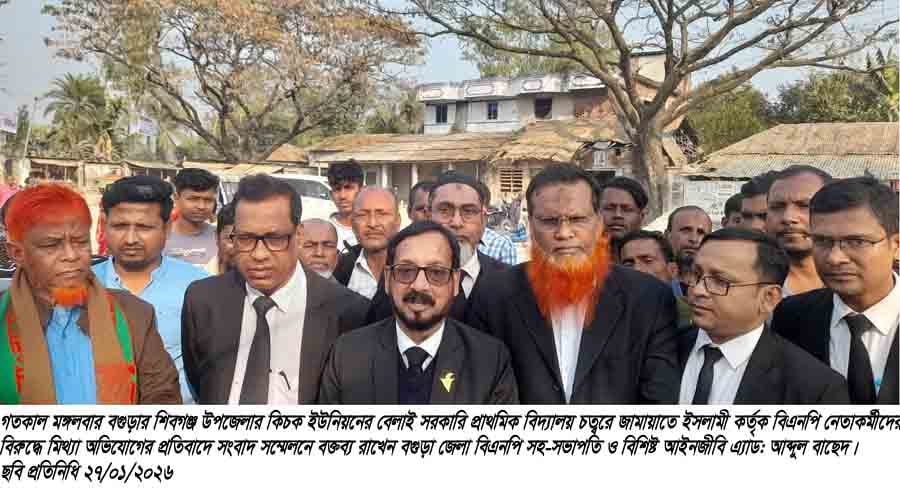 বগুড়া সংবাদ : বগুড়ার শিবগঞ্জে জামায়াতের ইসলামীর নির্বাচনী কার্যালয় ভাংচুরের মিথ্যা অভিযোগে বিএনপি নেতাকর্মীদের বিরুদ্ধে মিথ্যা অভিযোগের প্রতিবাদে সংবাদ সম্মেলন করা হয়েছে। মঙ্গলবার ( ২৭ জানুয়ারি) উপজেলার কিচক ইউনিয়নের বেলাই সরকারি প্রাথমিক বিদ্যালয় চত্বরে সংবাদ সম্মেলন করেন বগুড়া জেলা বিএনপির সহ-সভাপতি বিশিষ্ট আইনজীবি এ্যাড: আব্দুল বাছেদ। সংবাদ সম্মেলনে তিনি বলেন, গত সোমবার দুপুরে বেলাই স্কুল মাঠে জামায়াতে ইসলামী নির্বাচনী কার্যালয় নির্মাণ করতে গেলে স্কুল কর্তৃপক্ষ ও স্থানীয় জনগণ তাদের কাজে বাঁধা প্রয়োগ করে। এসময় স্কুল কর্তৃপক্ষ উপজেলা সহকারি রিটার্নিং কর্মকর্তাকে অবহিত করলে দায়িত্বপ্রাপ্ত ম্যাজিস্ট্রেড ঘটনাস্থলে গিয়ে নির্মাণ কাজ বন্ধ করেন এবং ২শত টাকা জরিমানা করেন। এর পর পুনরায় তারা নির্মাণ কাজ করতে গেলে স্থানীয় লোকদের সঙ্গে বাকবিতন্ডতা হয়। এ ঘটনা ভিন্ন খাতে প্রবাহিত করার জন্য জামায়াতের লোকজন স্থানীয় বিএনপির লোকজনের বিরুদ্ধে থানায় মিথ্যা অভিযোগ দায়ের করে। যাহার কোন ভিত্তি নাই। তারা বিএনপির প্রার্থী মীর শাহে আলমের বিজয় নিশ্চিত জেনে বিএনপির বিরুদ্ধে নির্বাচন বানচাল করার ষড়যন্ত্রে লিপ্ত হয়েছে। আমরা বিএনপি পরিবার তীব্র নিন্দা ও প্রতিবাদ জানাই এবং প্রকৃত ঘটনা তদন্ত সাপেক্ষে আইনগত ব্যবস্থাগ্রহনের দাবী জানাই। এসময় উপস্থিত ছিলেন জেলা বিএনপির দপ্তর সম্পাদক এ্যাড: হুমায়ন কবীর, এ্যাড: আতাউর রহমান রাজু, এ্যাড: হযরত বেলাল এসডু, এ্যাড: আনিছুর রহমান, এ্যাড: রুহুল আমিন বাবু, ইউনিয়ন বিএনপি সভাপতি আনিছুর রহমান, ওসমান গণি, আব্দুল আলীম প্রমুখ।