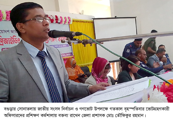 বগুড়া সংবাদ : আসন্ন ত্রয়োদশ জাতীয় সংসদ নির্বাচন ও গণভোট উপলক্ষে গতকাল বৃহস্পতিবার সকাল ১০টা থেকে বগুড়ার সোনাতলায় ৫৪ জন প্রিজাইডিং অফিসার,৩১৯ জন সহকারী প্রিজাইডিং অফিসার ও ৬৩৮ জন পোলিং অফিসারের প্রশিক্ষণ কর্মশালা অনুষ্ঠিত হয়েছে। উপজেলা পরিষদ মিলনায়তনে প্রিজাইডিং অফিসারদের ও সোনাতলা পাইলট বালিকা উচ্চ বিদ্যালয়ে সহকারী প্রিজাইডিং অফিসার ও পোলিং অফিসারদের প্রশিক্ষণ কর্মশালা অনুষ্ঠিত হয়। বগুড়া জেলা প্রশাসক মোঃ তৌফিকুর রহমান,পুলিশ সুপার মোঃ শাহাদাত হোসেন, জেলা সিনিয়র নির্বাচন অফিসার ফজলুল করিম,অতিরিক্ত জেলা নির্বাচন অফিসার আছিয়া খাতুন,উপজেলা নির্বাহী অফিসার স্বীকৃতি প্রামানিক,এসিল্যান্ড শাহানাজ পারভীন,থানার ওসি কবির হোসেন, উপজেলা কৃষি অফিসার সোহরাব হোসেন,উপজেলা নির্বাচন অফিসার সোহাগ চৌধুরী-সহ অনেকে কর্মশালায় উপস্থিত ছিলেন। উপজেলা প্রশাসন ও উপজেলা নির্বাচন অফিস এ কর্মশালার বাস্তবায়ন করে।