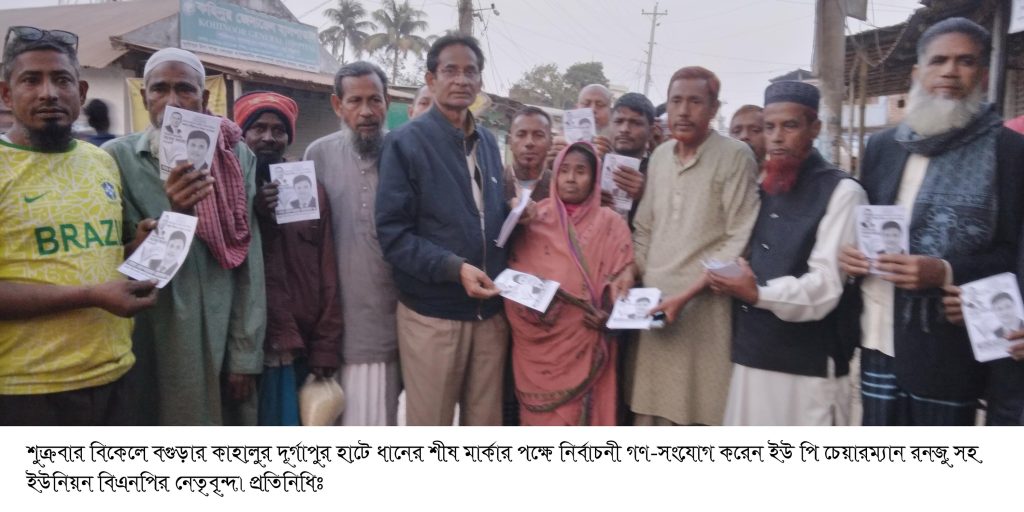 বগুড়া সংবাদ: শুক্রবার বিকেলে বগুড়ার কাহালুর দূর্গাপুর ইউনিয়ন বিএনপির উদ্যোগে দূর্গাপুর হাটে জেলা বিএনপির ভারপ্রাপ্ত সাধারণ সম্পাদক, বগুড়া-৪, কাহালু-নন্দীগ্রাম আসনের বিএনপি মনোনীত সংসদ সদস্য প্রার্থী ও সাবেক সংসদ সদস্য আলহাজ্ব মো. মোশারফ হোসেন এর ধানের শীষ মার্কার পক্ষে নির্বাচনী গণ-সংযোগ করেন বিএনপির নেতৃবৃন্দ।