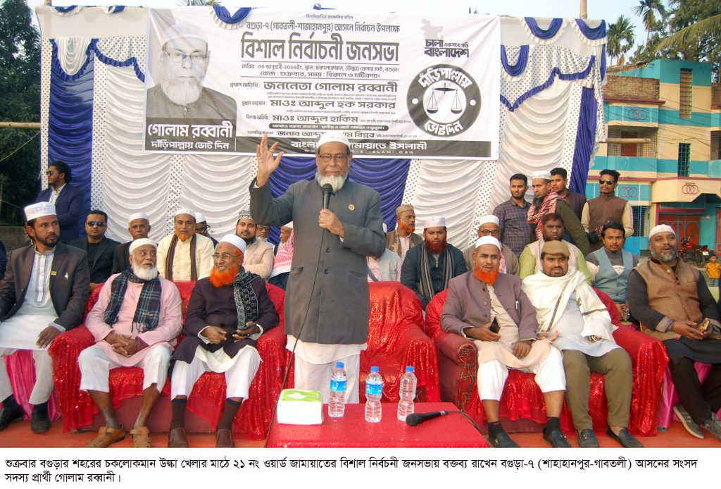 শুক্রবার (৩০ জানুয়ারি) বিকাল ৪ টায় চকলোকমান উল্কা খেলার মাঠে এ জনসভায় অনুষ্ঠিত হয়। ২১নং ওয়ার্ড জামায়াতের আমীর মাওলানা আব্দুস সালামের সভাপতিত্বে প্রধান অতিথি হিসেবে বক্তব্য রাখেন বগুড়া-৭ (শাজাহানপুর-গাবতলী) আসনে ঐক্যবদ্ধ বাংলাদেশ জোট মনোনীত সংসদ সদস্য প্রার্থী গোলাম রব্বানী।