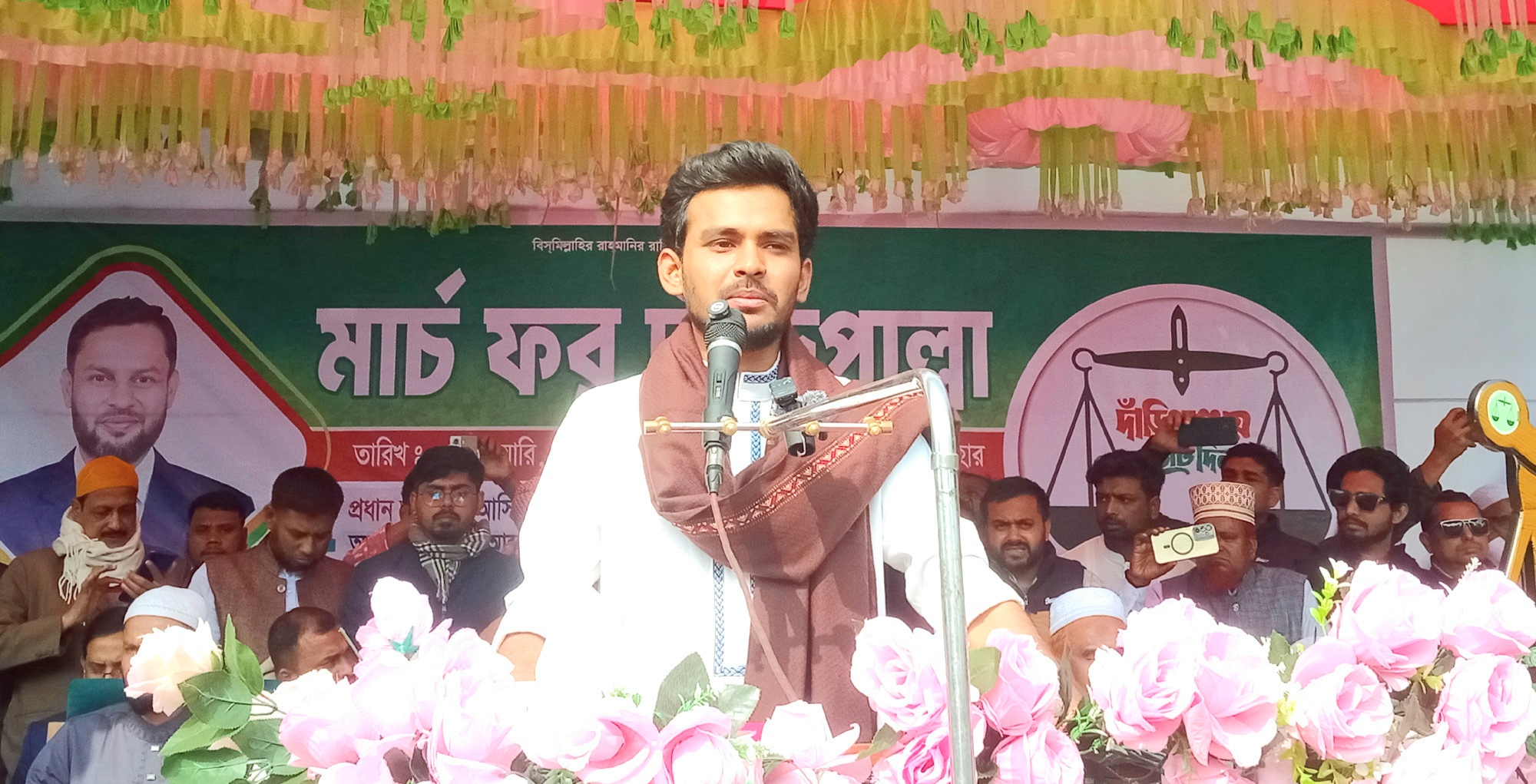 বগুড়া সংবাদ : বগুড়ার আদমদীঘি উপজেলার রহিম উদ্দিন ডিগ্রী কলেজ মাঠে “মার্চ ফর দাঁড়িপাল্লা” নির্বাচনী জনসভায় অনুষ্ঠিত হয়েছে। শনিবার সকালে আদমদীঘি রহিম উদ্দিন ডিগ্রী কলেজ মাঠে উপজেলা জামায়াতের আমীর হাফেজ আতোয়ার হোসেনের সভাপতিত্বে অনুষ্ঠিত নির্বাচনী জনসভায় প্রধান অতিথি হিসেবে বক্তব্যে রাখেন সাবেক যুব ও ক্রীড়া উপদেষ্টা এবং বৈষম্য বিরোধী ছাত্র আন্দোলনের অন্যতম সমন্বয়ক আসিফ মাহমুদ সজীব ভূঁইয়া। বিশেষ অতিথি হিসেবে বক্তব্য রাখেন বগুড়া জেলার জামায়াতের আমীর অধ্যক্ষ আব্দুল হক সরকার, জেলা জামায়াতের কর্ম পরিষদ সদস্য মাওঃ মমতাজ উদ্দিন, হাফেজ আব্দুন নূর, বগুড়া-৩ আসনের দাঁড়িপাল্লা মার্কার এমপি প্রাথী নূর মুহাম্মাদ আবু তাহের, বগুড়া-৪ আসনের এমপি প্রার্থী ড. মোস্তফা ফয়সাল পারভেজ, আদমদীঘি উপজেলা জামায়াতের সেক্রেটারী গোলাম রব্বানী, দুপচাঁচিয়া উপজেলা জামায়াতের নায়েবে আমীর বীর মুক্তিযোদ্ধা নজরুল ইসলাম, আদমদীঘি উপজেলা জামায়াতের নায়েবে আমীর ডাঃ ইউনূছ আলী, সহকারী সেক্রেটারী মাওঃ আব্দুল জোব্বার, রাকসু ভিপি মোস্তাকুর রহমান জাহিদ, জগন্নাত বিশ্ববিদ্যালয়ের জিএস আব্দুল আলিম আবিদ, কেন্দ্রীয় দাওয়াত সম্পাদক মোজাফফর হোসেন, রাজশাহী মহানগর এনসিপির আহবায়ক মোবাশ্বের আলী, জামায়াত নেতা আহসান হাবীব পল্টু, ফরিদুল হক, আহসান হাবীব তুহিন, আদমদীঘি উপজেলা যুব বিভাগের সভাপতি তরিকুল ইসলাম, সেক্রেটারী রেজওয়ানুল হক, এ্যাড. সাইফুল ইসলাম, রবিউল ইসলাম, এনামুল হক, এ্যাড. সোহেল, বগুড়া জেলা ছাত্র শিবিরের সভাপতি সাইয়েদ কুতুব সাব্বির, সেক্রেটারী সাদ্দাম হোসেন,আদমদীঘি উপজেলা ছাত্র শিবের সভাপতি নকিব আরমান, সেক্রেটারী আব্দুস সালাম প্রমূখ। আলোচনা শেষে প্রধান অতিথি আসিফ মাহমুদ সজীব ভুঁইয়া বগুড়া-৩ (আদমদীঘি-দুপচাঁচিয়া) এলাকার ত্রয়োদশ জাতীয় সংসদ নির্বাচনে দাঁড়িপাল্লা মার্কার প্রার্থী নূর মুহাম্মাদ আবু তাহের কে পরিচয় করিয়ে দিয়ে দাঁড়িপাল্লা মার্কায় ভোট চান।