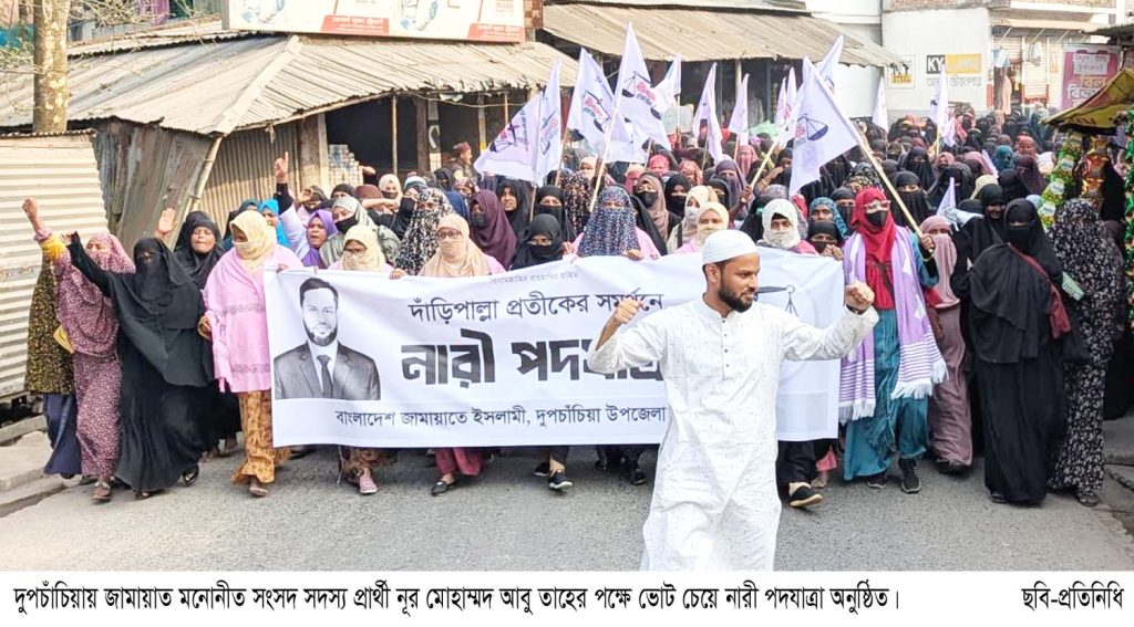 বগুড়া-৭ আসনে জামায়াত প্রার্থীর দাঁড়িপাল্লা নিয়ে হাজারো নারীর রাজপথে মিছিল