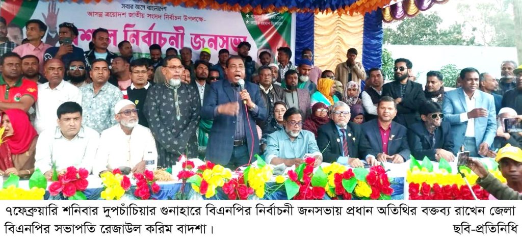 গুনাহার ইউনিয়ন বিএনপির আয়োজনে বিএনপি মনোনীত সংসদ সদস্য প্রার্থী আব্দুল মহিত তালুকদার এর সভাপতিত্বে ও উপজেলা বিএনপির সাধারণ সম্পাদক আব্দুর রহিমের পরিচালনায় জনসভায় বিশেষ অতিথির বক্তব্য রাখেন জেলা বিএনপির সহসভাপতি ও শহর বিএনপির সভাপতি এ্যাড. হামিদুল হক চৌধুরী হিরু। আমন্ত্রিত অতিথির বক্তব্য রাখেন জেলা বিএনপির সাবেক যুগ্ম সাধারণ সম্পাদক পরিমল চন্দ্র, প্রবাসী কল্যাণ বিষয়ক সম্পাদক আব্দুল মান্নান, জাতীয়তাবাদী আইনজীবী ফোরাম সভাপতি এ্যাড.আতাউর রহমান খান মুক্তা, জেলা যুবদলের সভাপতি জাহাঙ্গীর আলম, তথ্য ও যোগাযোগ বিষয়ক সম্পাদক ফয়সাল ইসলাম, জেলা ছাত্রদলের সভাপতি হাবিবুর রশিদ সন্ধান সরকার, জেলা সাধারণ সম্পাদক নাজমা আক্তার। উপজেলা বিএনপির সভাপতি একেএম মনিরুল ইসলাম খান স্বপন, সাবেক সভাপতি আব্দুল হামিদ, সাবেক সাধারণ সম্পাদক জাহাঙ্গীর আলম, পৌর বিএনপির ভারপ্রাপ্ত সভাপতি এ্যাড. সাইফুর রহমান মিলু, সাধারণ সম্পাদক আখতারুজ্জামান তুহিন, উপজেলা যুবদলের আহŸায়ক আফছার আলী, যুগ্ম আহবায়ক আবদুস সবুর খন্দকার রাকিব, ইব্রাহীম আলী, পৌর যুবদলের সিনিয়র যুগ্ম আহবায়ক নাঈম কবিরাজ, উপজেলা ছাত্রদলের সভাপতি শামীম সরদার, সাধারণ সম্পাদক ফজলে রাব্বি প্রমুখ। এসময় বিএনপি ও অঙ্গ সহযোগী সংগঠনের বিপুল সংখ্যক নেতাকর্মী ও এলাকার সর্বস্বরের জনগণ উপস্থিত ছিলেন