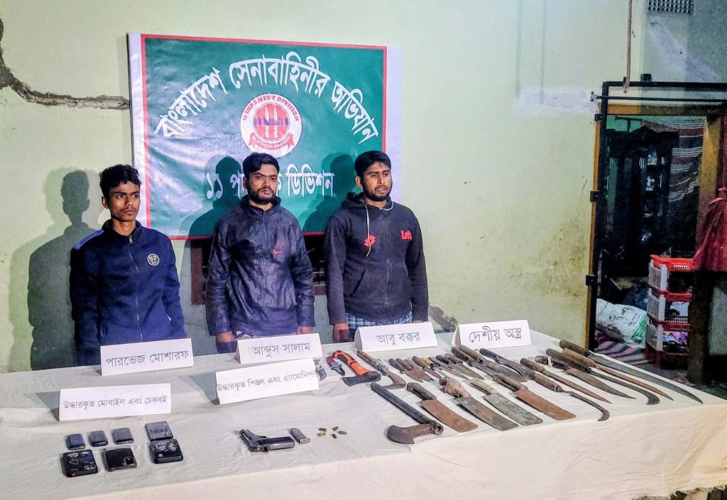সেনাবাহিনী সূত্রে জানা গেছে, গোপন সংবাদের ভিত্তিতে পরিচালিত বিশেষ অভিযানে তাদের কাছ থেকে একটি বিদেশি পিস্তলসহ বিপুল পরিমাণ দেশীয় অস্ত্র উদ্ধার করা হয়। পরে তাদের আটক করে আইনশৃঙ্খলা বাহিনীর কাছে হস্তান্তর করা হয়েছে।