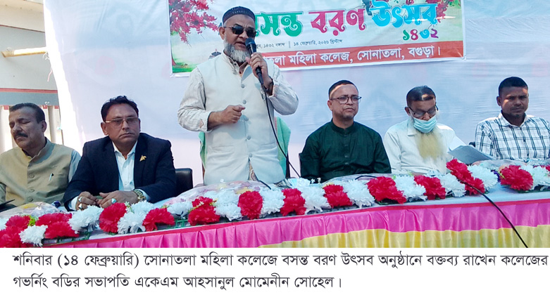 বগুড়া সংবাদ : শনিবার (১৪ ফেব্রæয়ারি) সকাল ১১টা থেকে বিকেল সাড়ে ৩টা পর্যন্ত বগুড়ার সোনাতলা মহিলা কলেজে নানা আয়োজনে পালিত হলো বসন্ত বরণ উৎসব। অনুষ্ঠানে ভারপ্রাপ্ত অধ্যক্ষ শফিকুল ইসলাম বাদশার সভাপতিত্বে প্রধান অতিথির বক্তব্য রাখেন কলেজের গভর্নিং বডির সভাপতি একেএম আহসানুল মোমেনীন সোহেল। উপস্থিত ছিলেন বালুয়াহাট ডিগ্রি কলেজের অবসরপ্রাপ্ত সহকারী অধ্যাপক এটিএম গোলাম রকিব,তোফাজ্জল হোসেন, সোনাতলা মহিলা কলেজের সহকারী অধ্যাপক আবু বকর সিদ্দিক,আব্দুল মোত্তালিব ফরিদ, বালুয়া ইউনিয়ন পরিষদের সাবেক চেয়ারম্যান রুহুল আমিন, সোনাতলা পৌর বিএনপির সাধারণ সম্পাদক শরিফুল ইসলাম খাঁন নিপু, কলেজের অন্যান্য শিক্ষক,কর্মচারী ও ছাত্রীরাসহ অনেকে। বক্তব্য শেষে নৃত্য ও সাংস্কৃতিক অনুষ্ঠান হয়। সোনাতলা সাংস্কৃতিক সংগঠনের প্রতিষ্ঠাতা সভাপতি উজ্জ্বল হোসেন খোকন অনুষ্ঠানে সঞ্চালনা করেন।